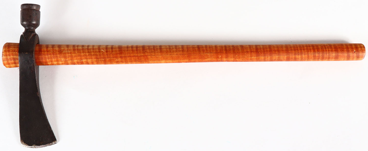 Antique hatchet, wood handle, looks like maybe a piece pipe but bowl is filled in and cannot tell if there is a pipe. Grade: Excellent - Value: 50 to 250