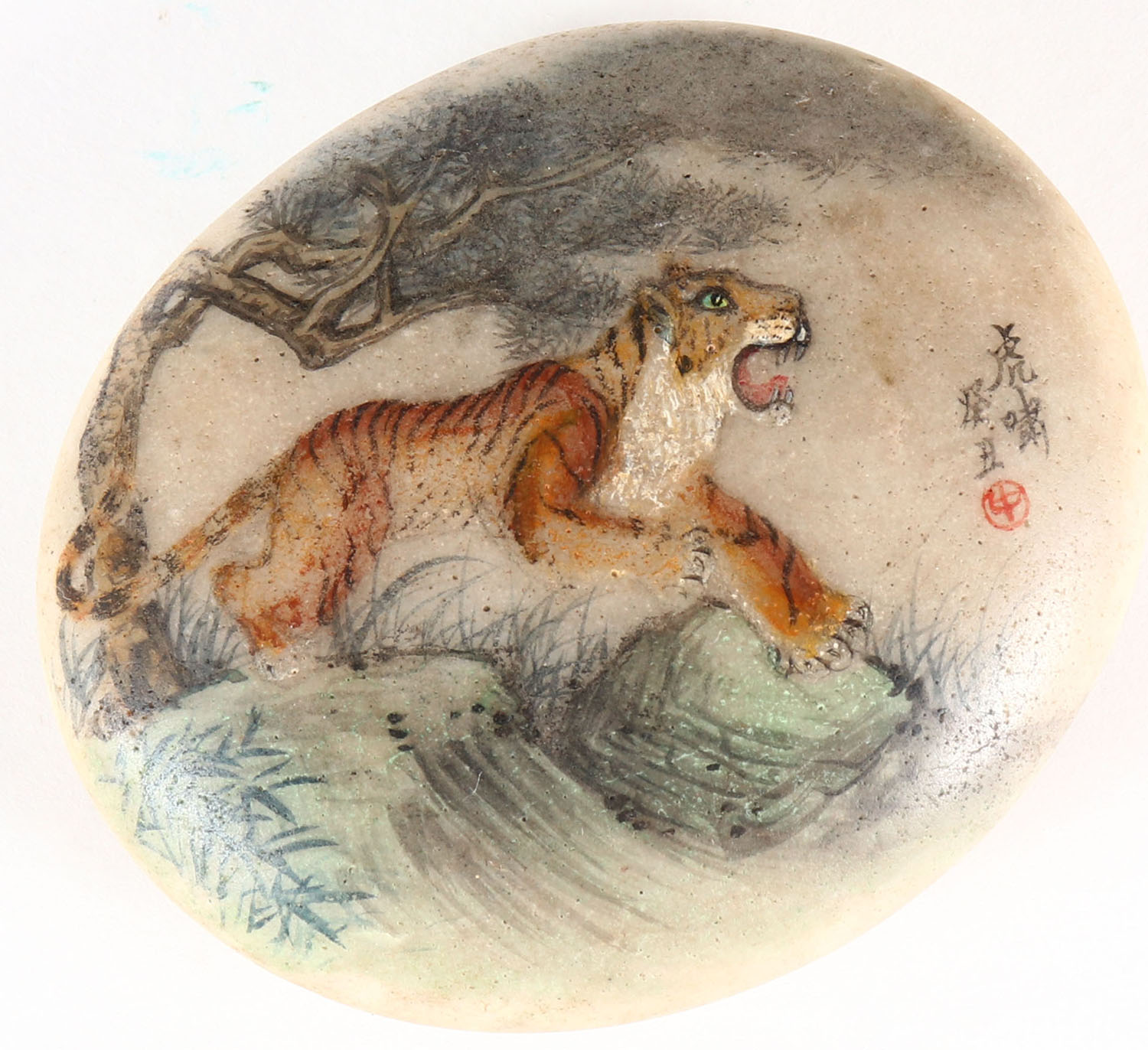 Foreign paper weight, has Chinese writing, beautiful drawing to rock. Grade: Excellent - Value: 4 to 40