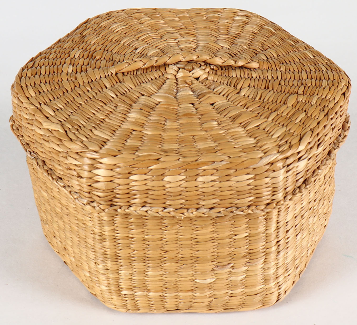 Northwest Coast Indian seed storage basket, Hex lid, circa 1915. Grade: Excellent - Value: 20 to 100