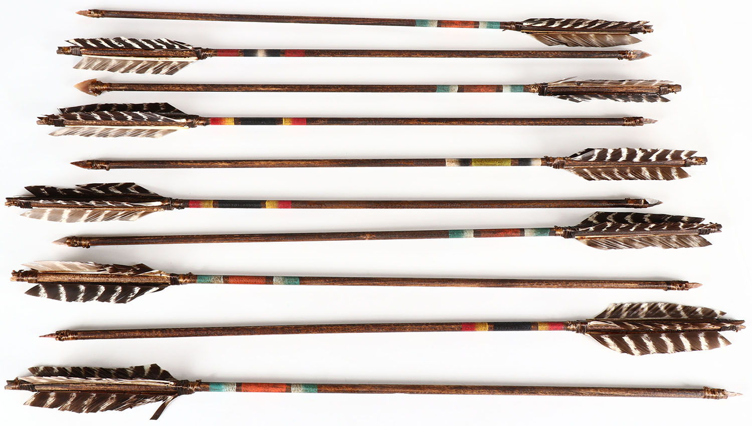 Large lot of handmade Native American arrows, flint tip with bird feathers and well made! Grade: Excellent - Value: 100 to 300