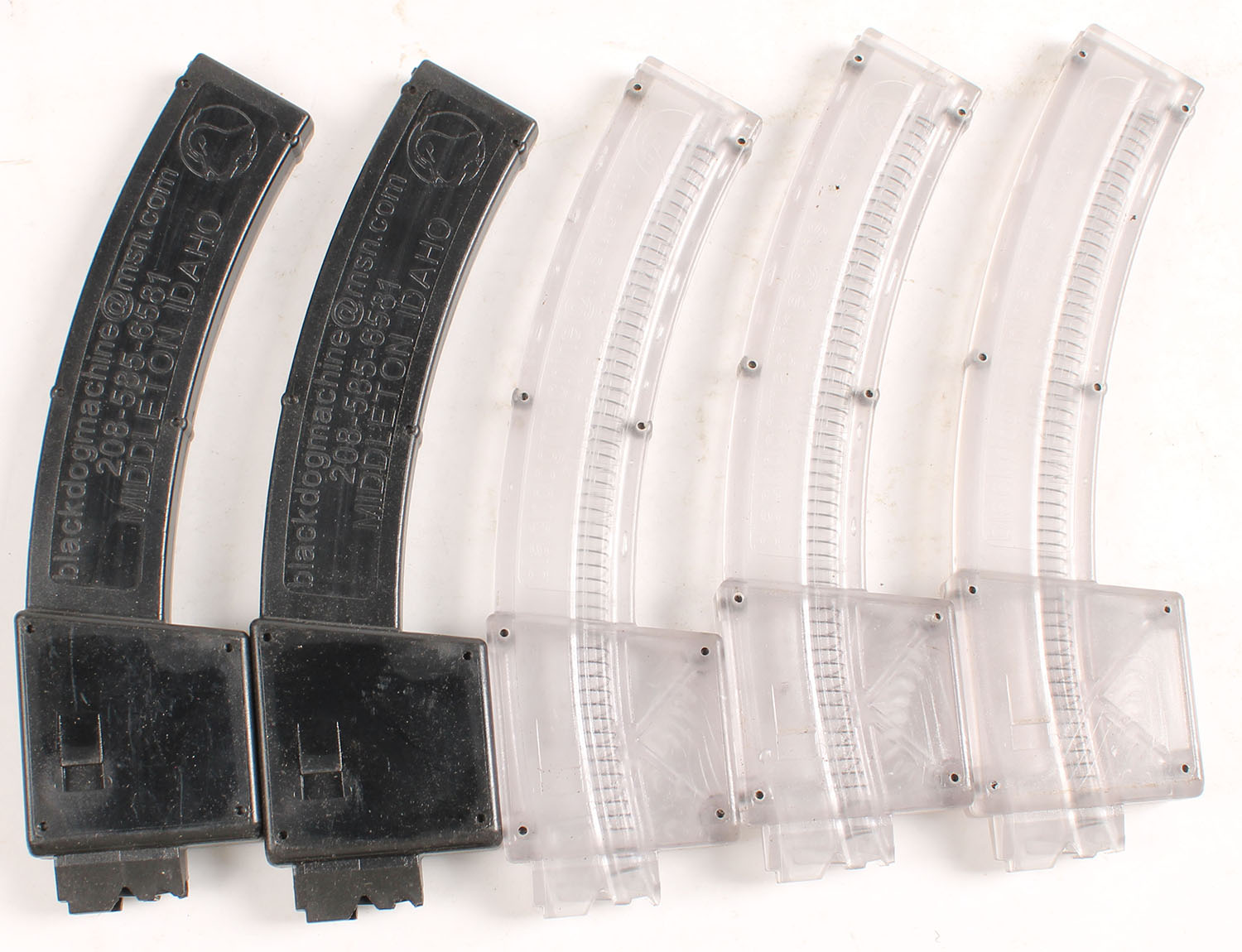 Lot of five, Black Dog Machine, AR-15/.22 LR /30Rd magazines, two black three clear plastic. Grade: Excellent - Value: 40 to 80
