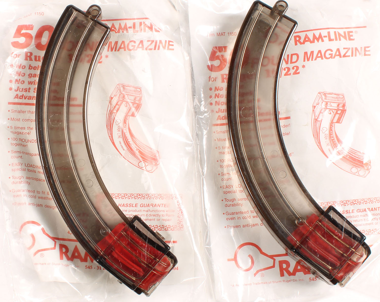 Lot of two, Ram-Line 50Rd. Ruger 10/22 Magazines, both in original packaging. Grade: Excellent - Value: 40 to 80