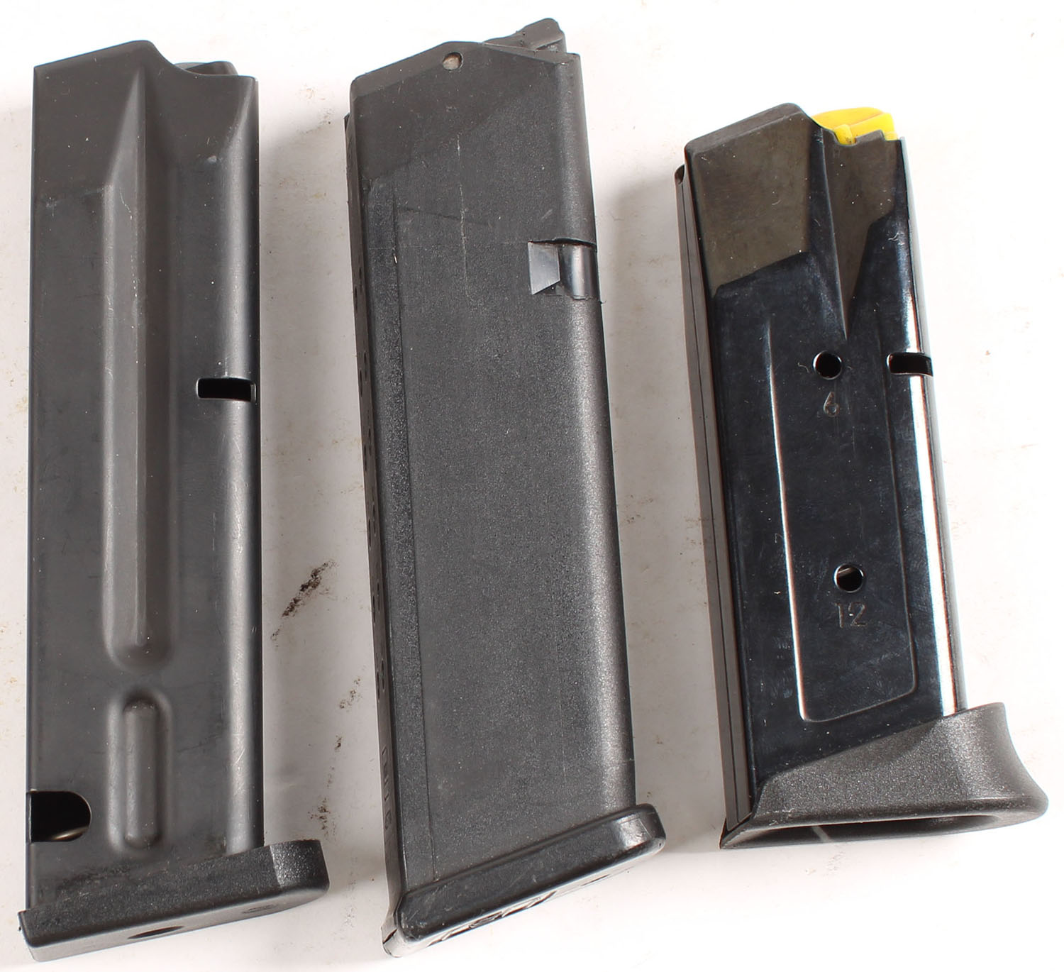 Lot of three mixed mags, one Glock .357 sig 15Rd. Mag, one berretta 9mm 10 Rd. mag, one Brazilian 9mm 12Rd. Mag. Grade: Excellent - Value: 10 to 30