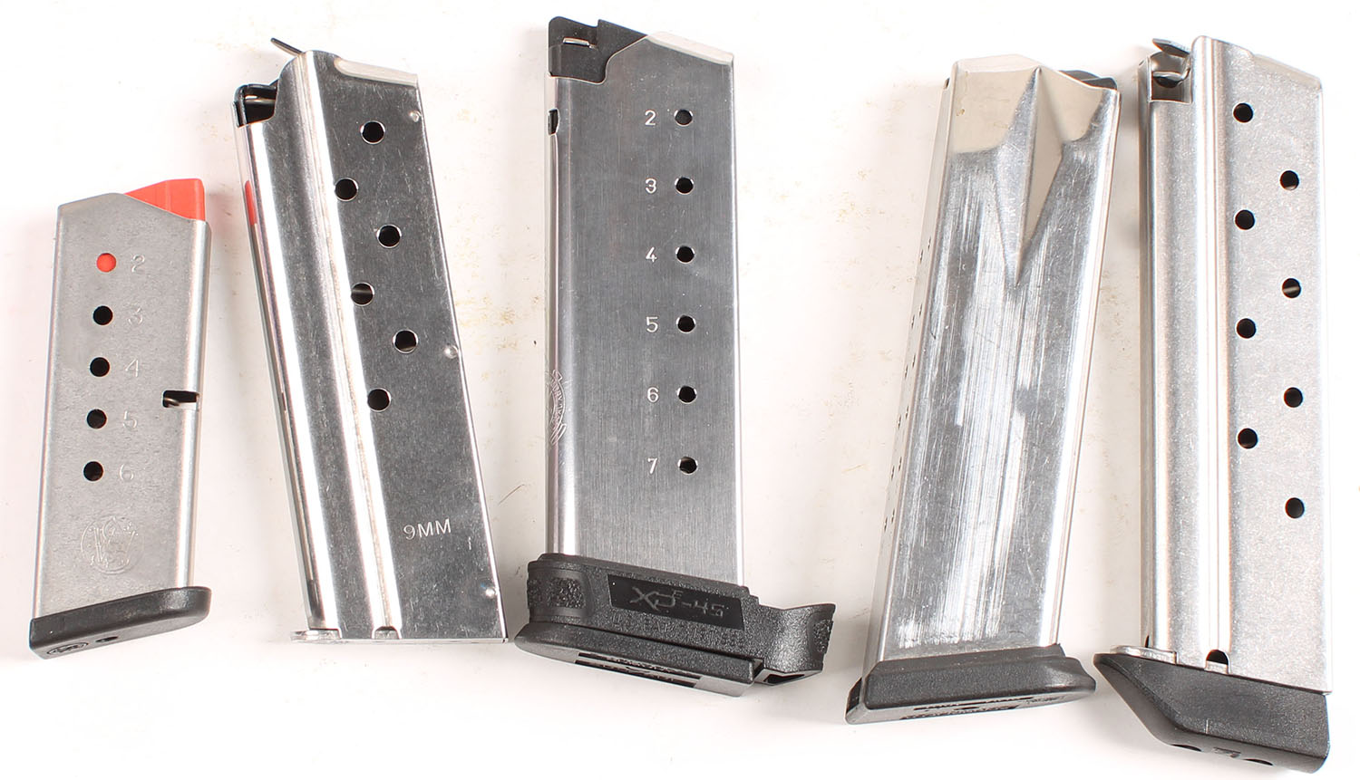 Lot of five mags, one XDE-45 45ACP 7Rd. Mag, one S&W .380 6Rd. Mag, one Ruger 9mm 8Rd. Mag, one Springfield armory 9mm 16Rd. Mag, & one unmarked 9mm M1911 mag. Grade: Excellent - Value: 20 to 40