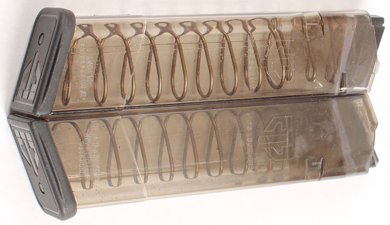 Lot of two, ETS Group .45 ACP 18Rd. Glock mags, clear plastic. Grade: Very Good ++ - Value: 20 to 40