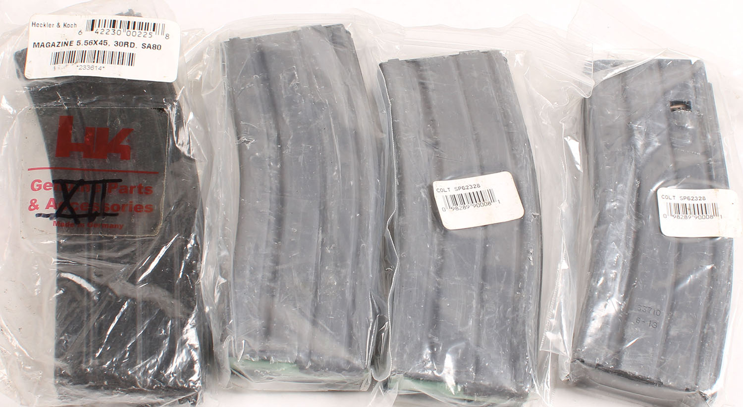 Lot of Four Mags, one H&K 416 steel mag, & three Colt AR-15 aluminum mags, all 30Rd. 5.56/.223 Mags., all in original packaging. Grade: Excellent + - Value: 30 to 90