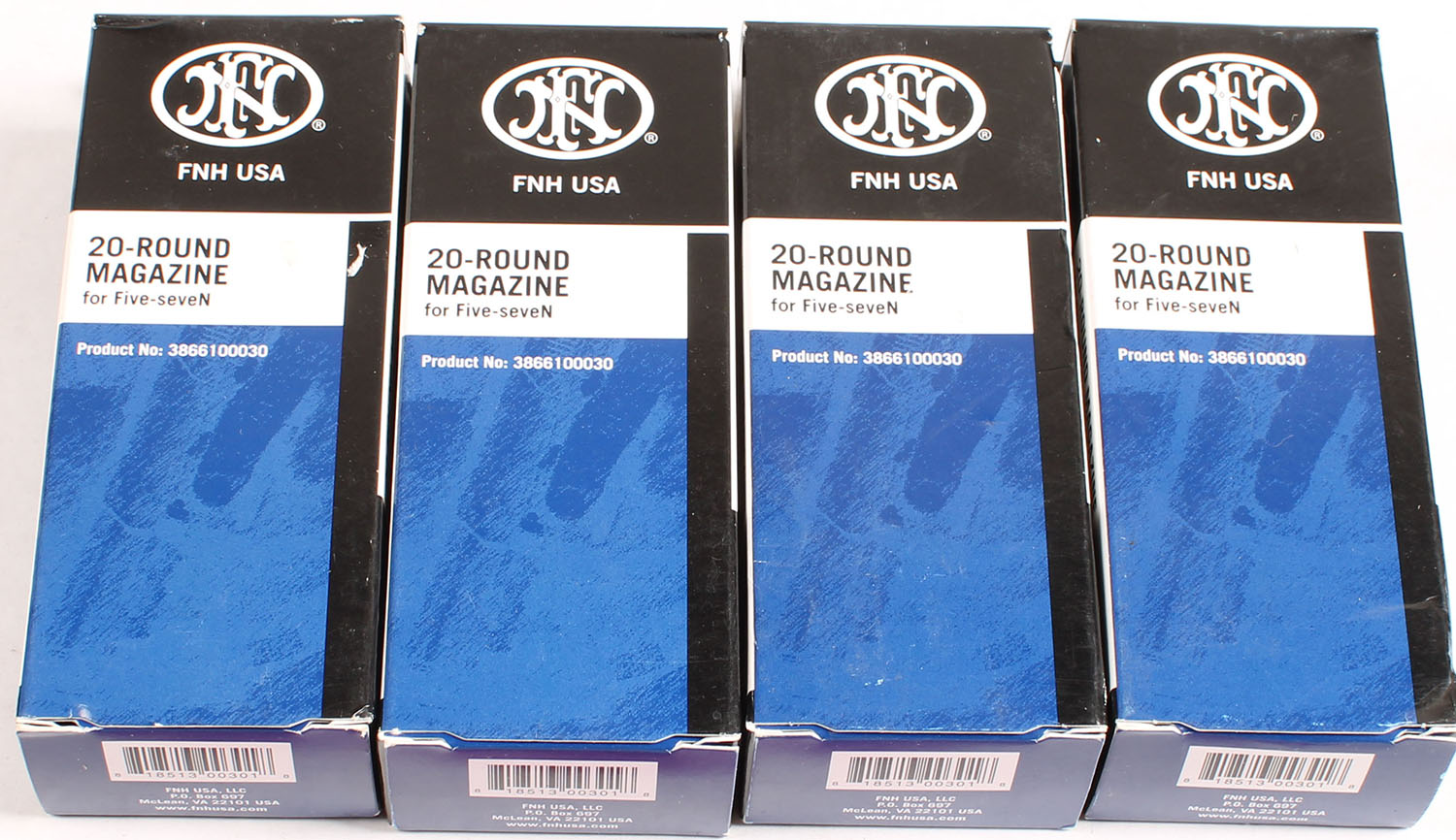 Lot of four, FN Five-Seven 20Rd. Mags, all in original boxes. Grade: Excellent - Value: 50 to 150