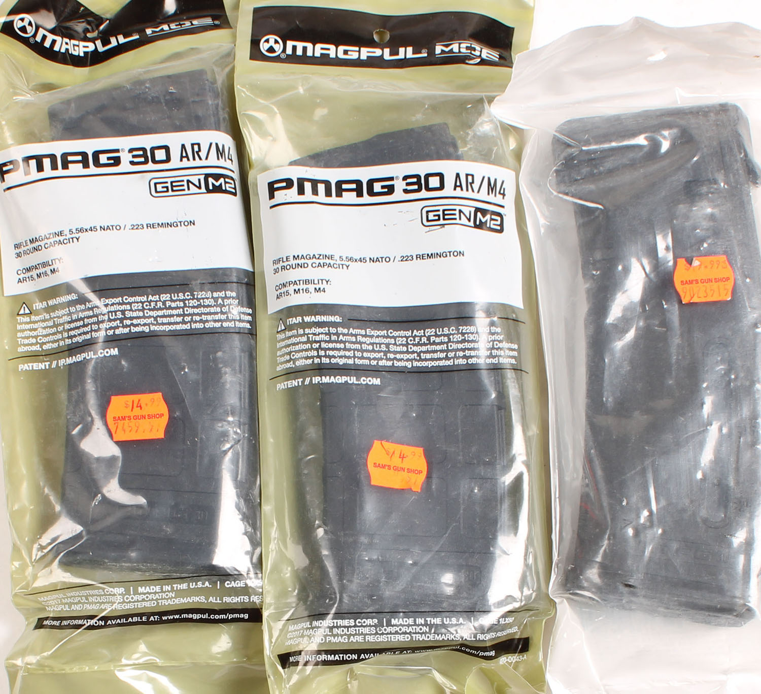 Lot of three Magpul, 30 Rd. AR-15 5.56/.223 mags, two are Gen 2 Pmags & one is a Emag, all in original packaging. Grade: Excellent - Value: 20 to 60