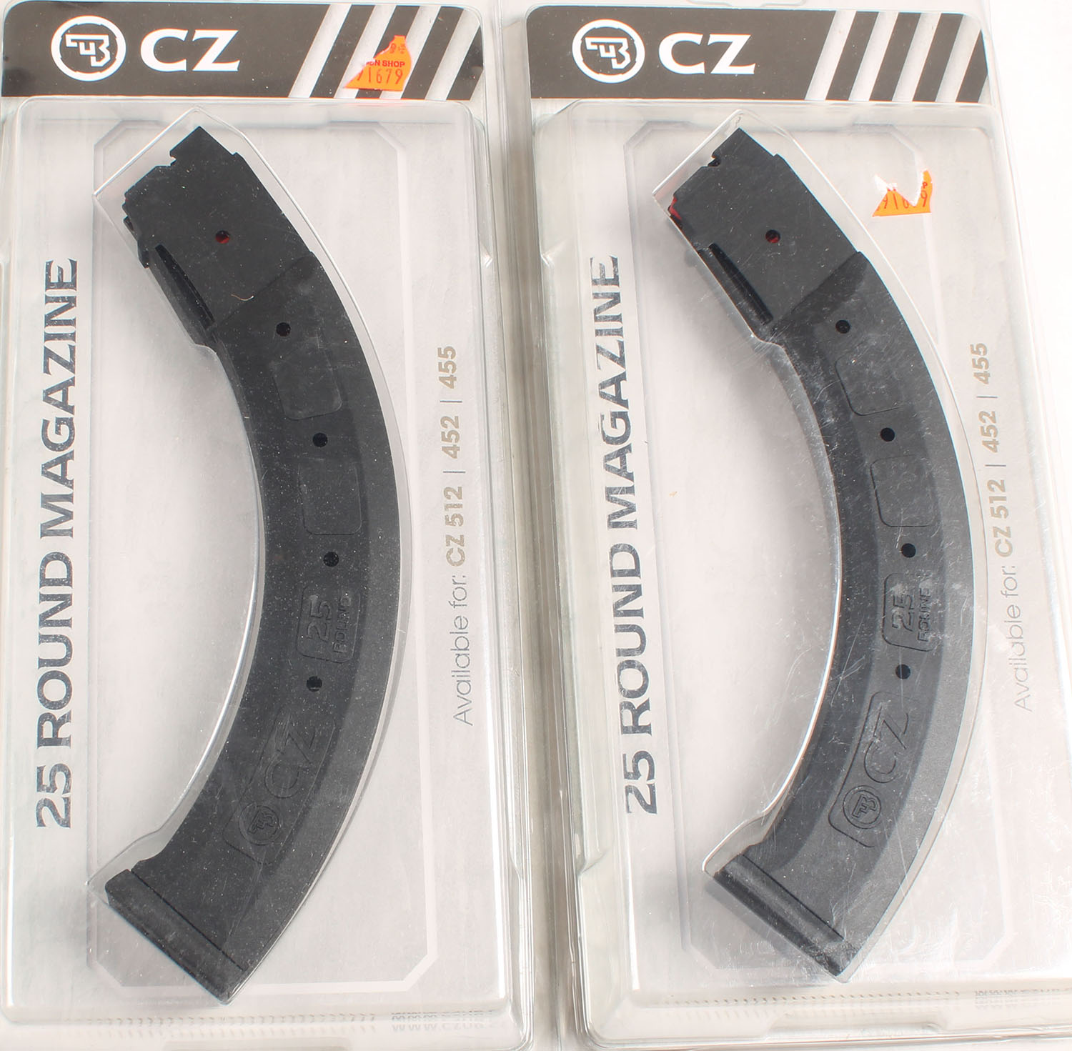Lot of two, CZ, .22LR 25Rd. Mags for CZ models 512,452,455, all in original packaging. Grade: Excellent ++ - Value: 30 to 80