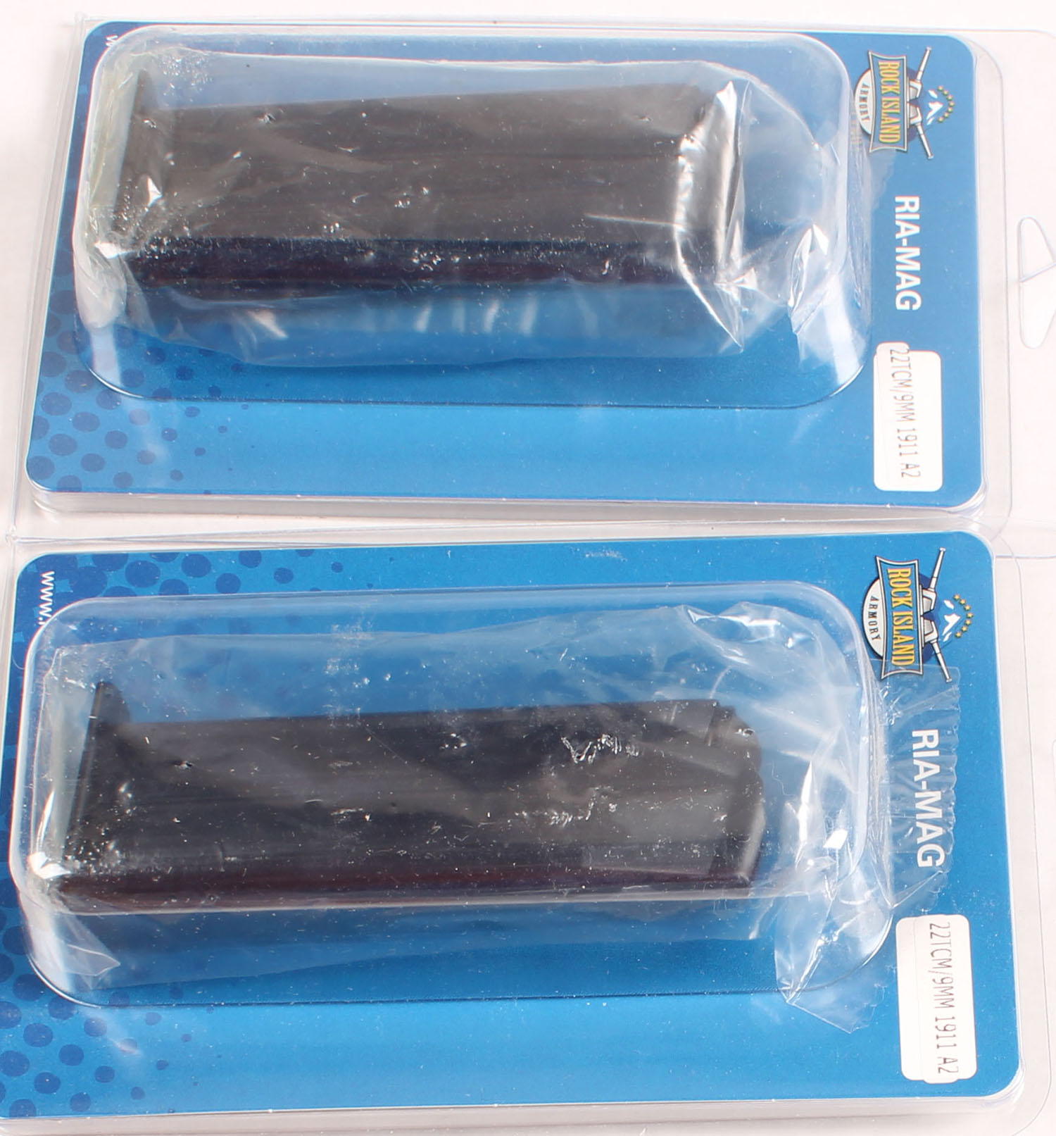 Lot of two, Rock Island armory, .22TCM/9mm 17Rd. M1911 mags, in original packaging. Grade: Excellent - Value: 30 to 60