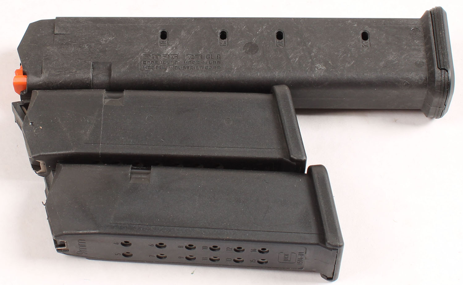 Lot of three 9mm mags, two Glock mags, one 15Rd. & one 10Rd. Mag, the other mag is a Magpul Pmag 27 GL 9. Grade: Very Good ++ - Value: 20 to 60