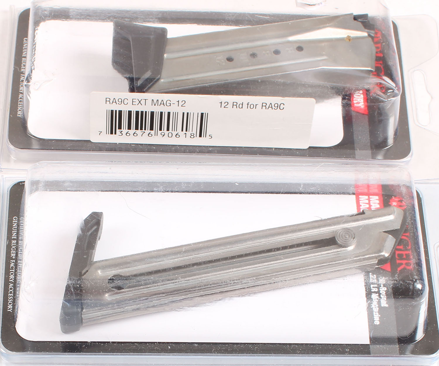 Lot of two, Ruger mags, one 12 Rd. 9mm RA9C mag, & one Mark IV 22/45 10 Rd. .22LR mag, both in original packaging. Grade: Excellent - Value: 20 to 40