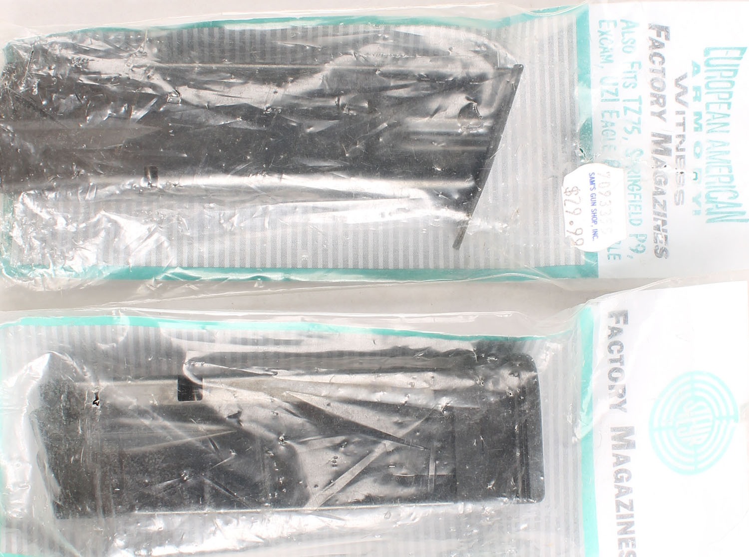 Lot of two mags, one Steyr 10 Rd. .357 mag, & one European American Armory Witness factory mag, .40S&W/.41AE 12 Rd. mag, fits TZ75, Springfield P9, Excam, Uzi eagle & baby eagle. Both in original packaging. Grade: Excellent - Value: 10 to 40