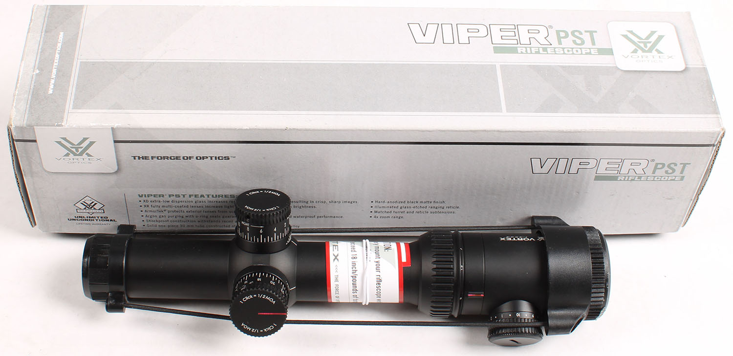 Vortex, Viper PST , 1-4 x 24mm, Low- Power Variable Magnification Rifle Scope, NIB, 30mm Tube Diameter, Second Focal Plane TMCQ (MOA) Illuminated Reticle, Fixed Parallax, Fast Focus Eyepiece, Nitrogen Gas Purged Aluminum Housing, Waterproof, Fog proof, Shock Proof, 9.7'' Inches long, weighs 18.4 Ounces, Tall Height turrets, 1/2 MOA clicks are audible and positive, Fully Multi-Coated Glass, comes with CR2023 Battery, cleaning cloth, and Vortex's unbeatable Unconditional Lifetime Warranty. Gade: MINT - Value: 200 to 400