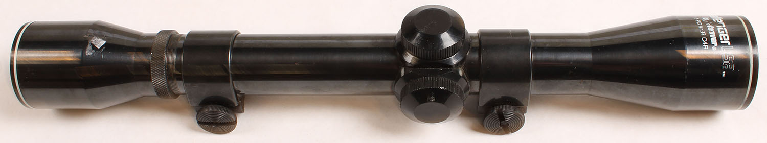 Challenger USA by Weaver, C4r fixed 4X scope, low capped turrets with non-audible & non-positive adjustment, fixed parallax, adjustable focus, has two weaver scope rings. Grade: Excellent + - Value: 30 to 100