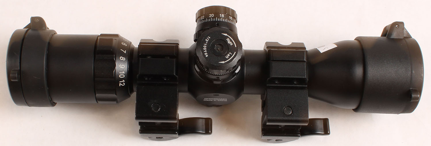 UTG, 3-12x scope, locking medium height towers, 1/3'' MOA adjustments, clicks are positive & audible, 3 to infinite yards parallax, adjustable focus, 1 inch tube, comes with lens covers & quick detach scope rings. Grade: Excellent + - Value: 60 to 120