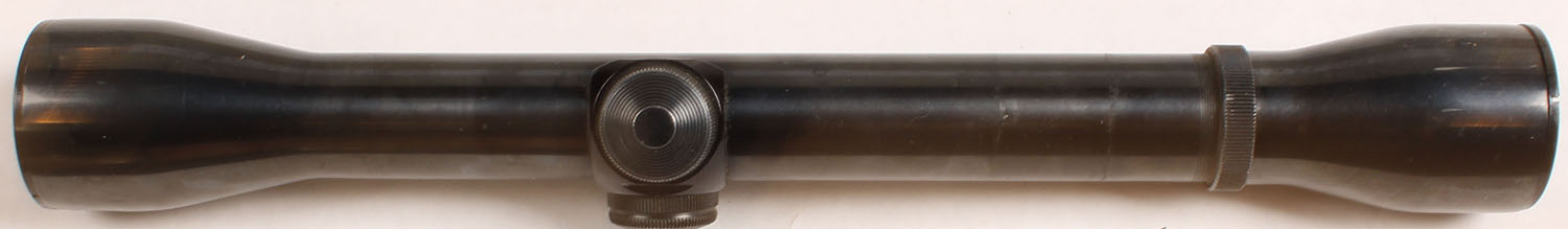 Weaver, K4-C3, 4x, capped turrets, fixed parallax, adjustable focus, 1 inch tube, tube has a slight dent by the forward objective lens. Grade: Very Good + - Value: 40 to 80