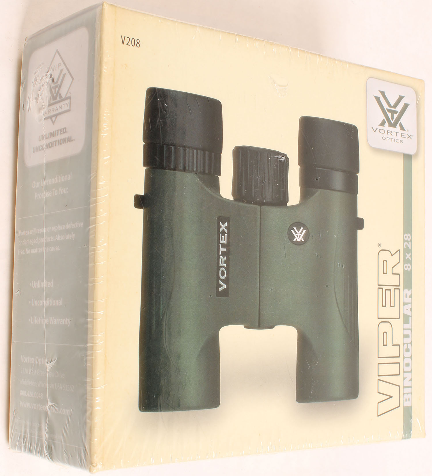 Vortex, Viper, 8x28 Binocular, NIB, comes with carrying case, neck strap, rain guard eyepiece cover, tethered lens covers, and lens cleaning cloth. Grade: MINT - Value: 50 to 200