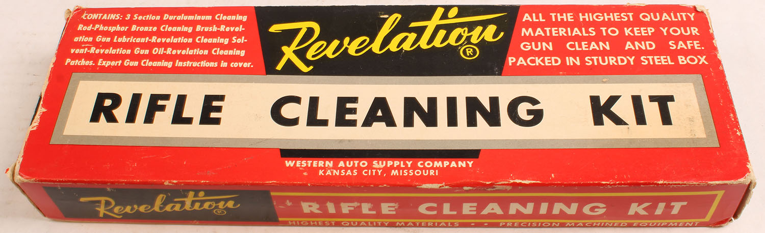 Revelation rifle cleaning kit, FULL with oil tin, with cleaning patches, has age soiling Grade: Very Good + - Value: 4 to 40