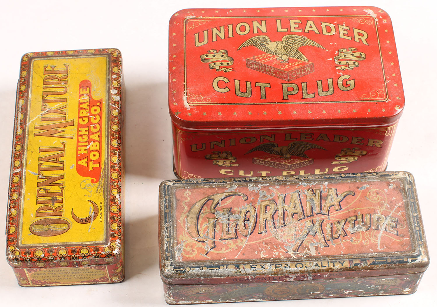 Early! Lot of 3 tobacco tins, beautiful graphics all over. Grade: Excellent - Value: 20 to 80