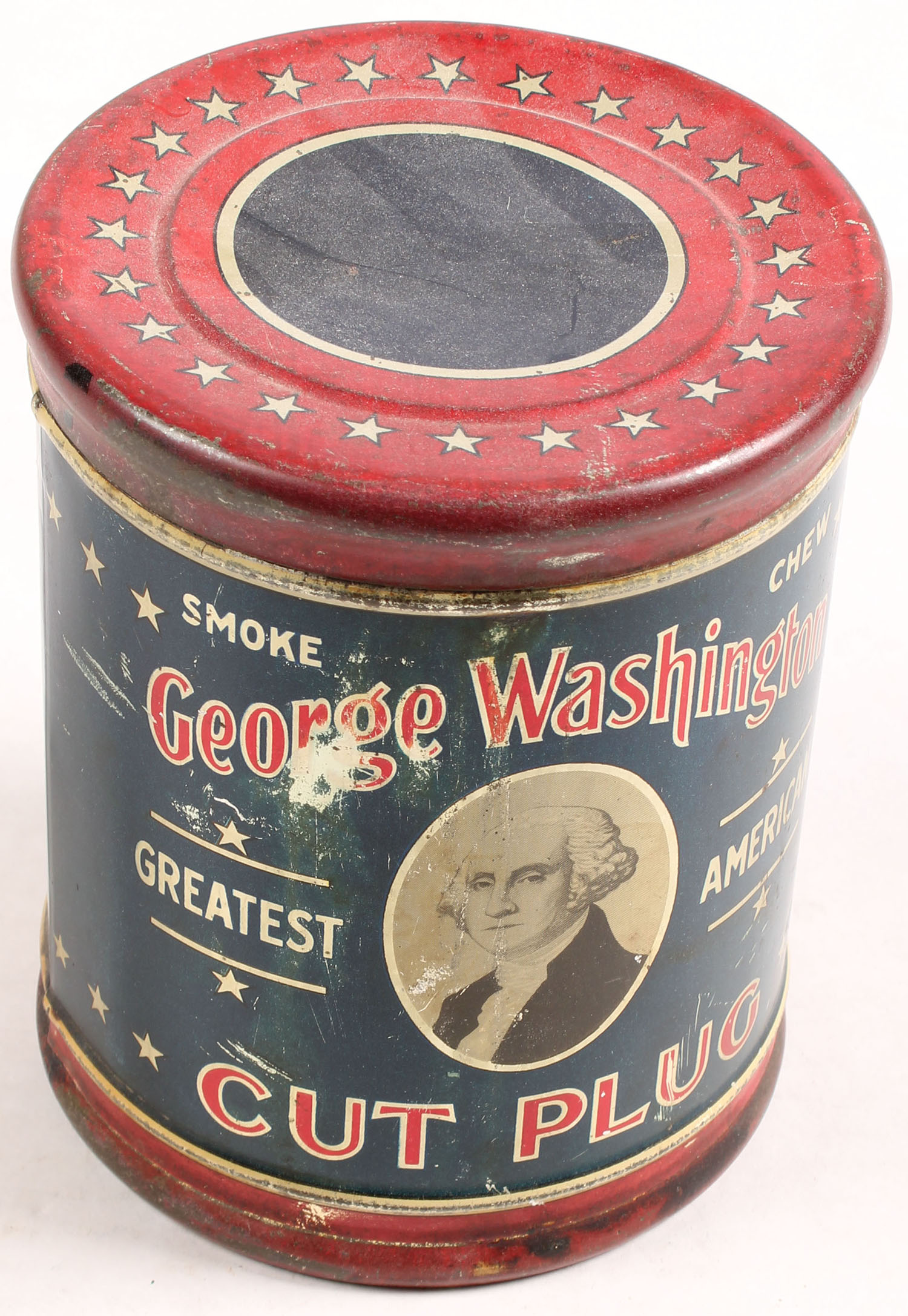 Large! Early! George Washington tobacco tin, beautiful graphics all over. Grade: Excellent - Value: 40 to 250