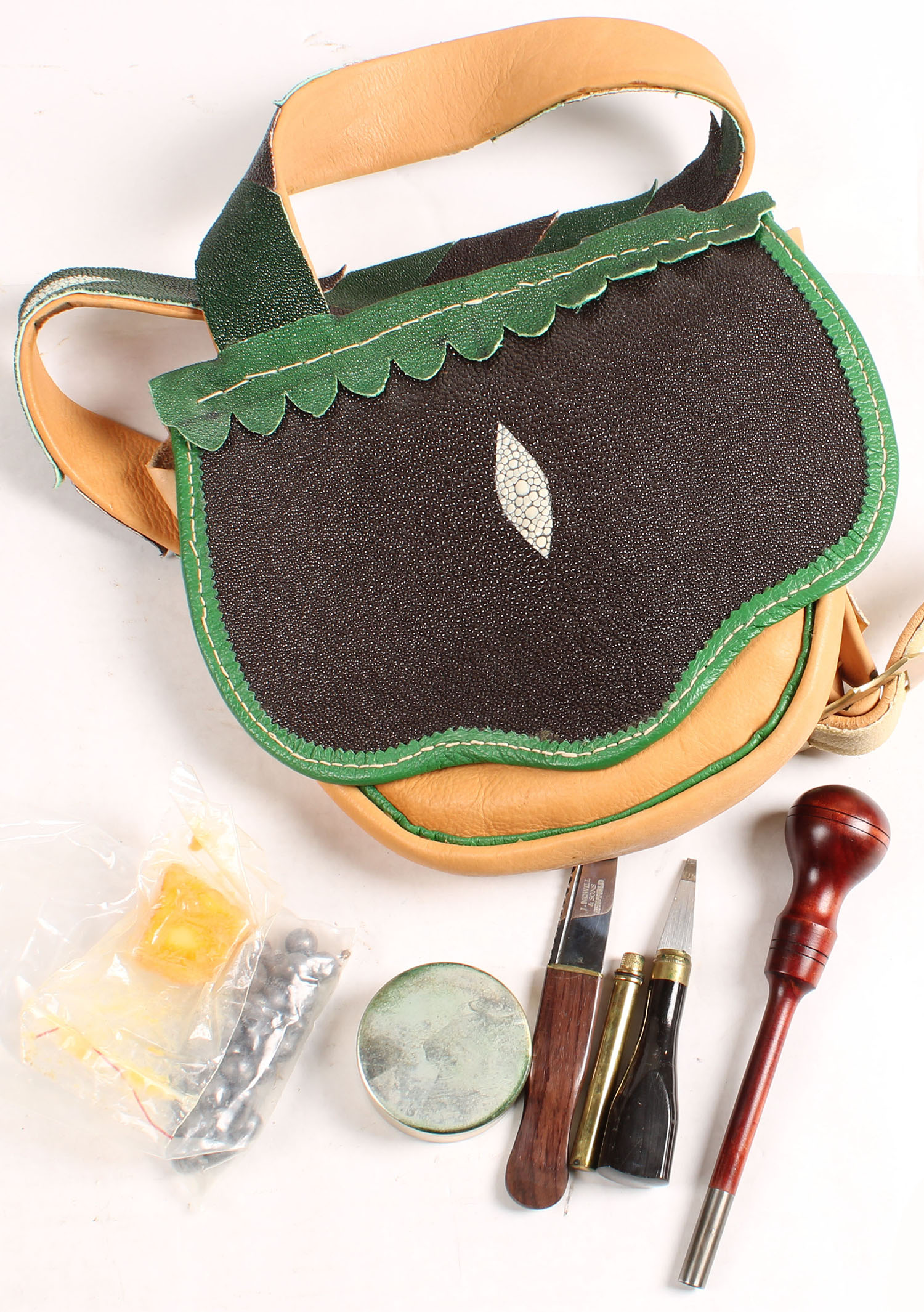 Leather and cloth bag, very nice and intricate green and black design, with various tools inside, all bright and clean, no markings. Grade: Excellent ++ - Value: 20 to 150