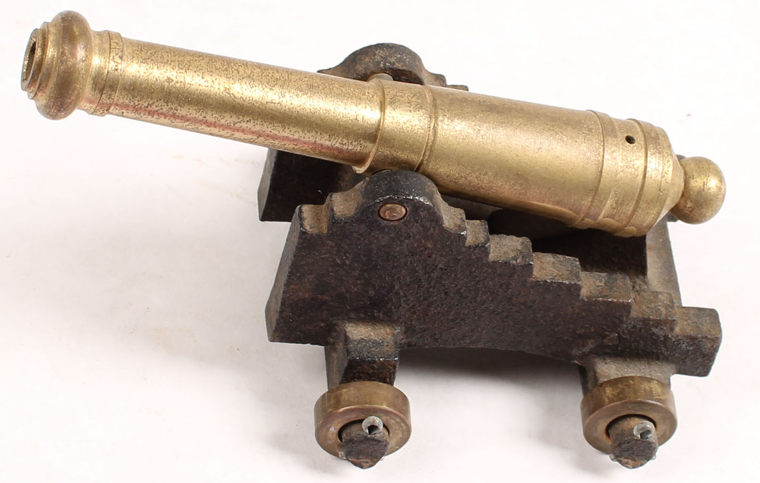 Brass cannon and wheels on cat iron stand. Grade: Very Good - Value: 16 to 60