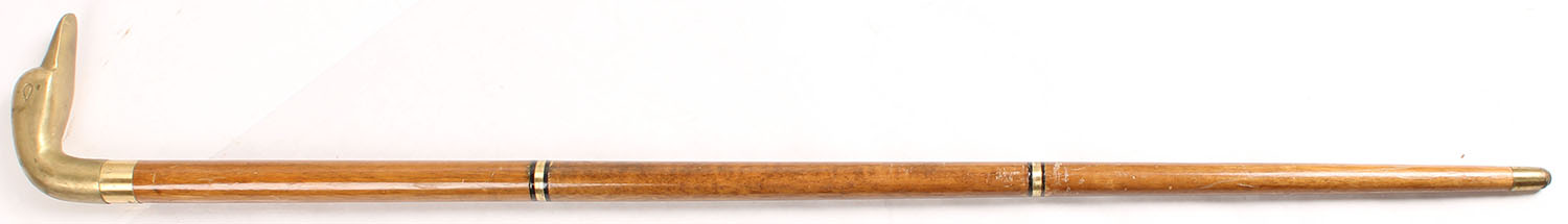 Wood and brass walking stick, handle is shaped like a ducks head, 35'' OAL. Grade: Excellent - Value: 10 to 50