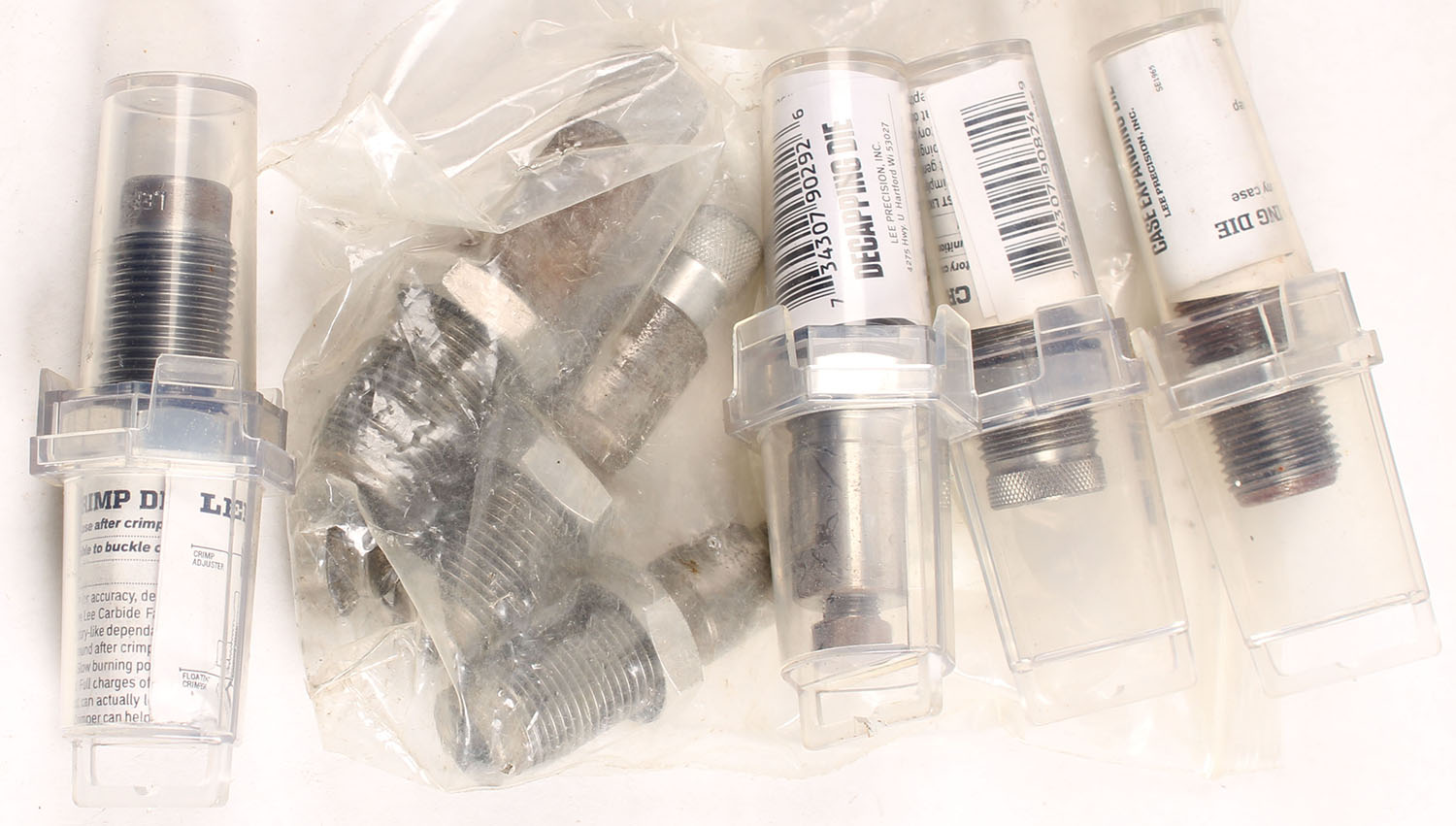 LEE reloading tools, De-capper, crimp die, universal expanding die, (3) .45/70 dies, (1) .30-06 Die Grade: Excellent - Value: 4 to 40
