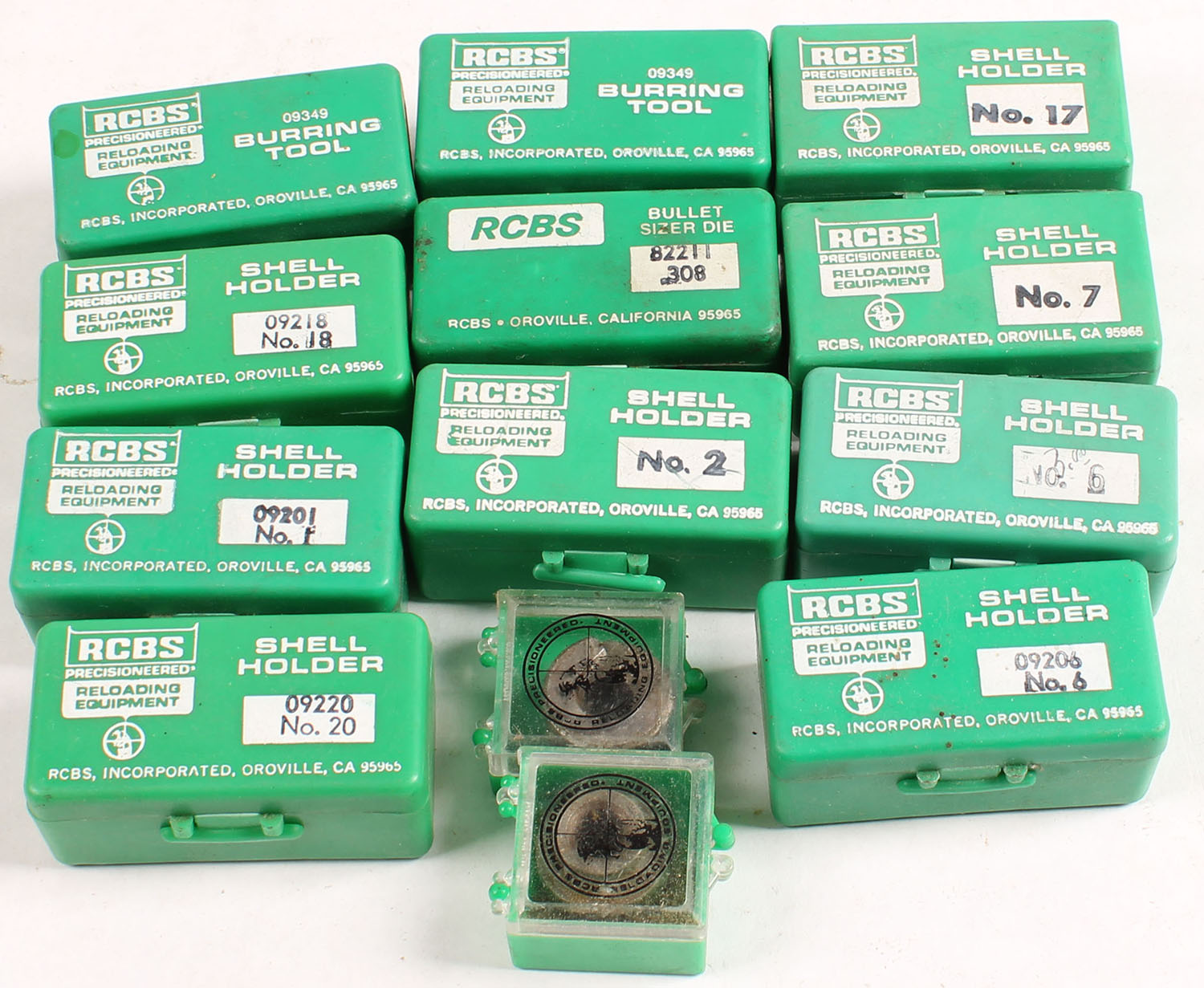 Large lot of RCBS tools, shell holder, bullet sizer die and burring tool. Grade: Excellent - Value: 10 to 60