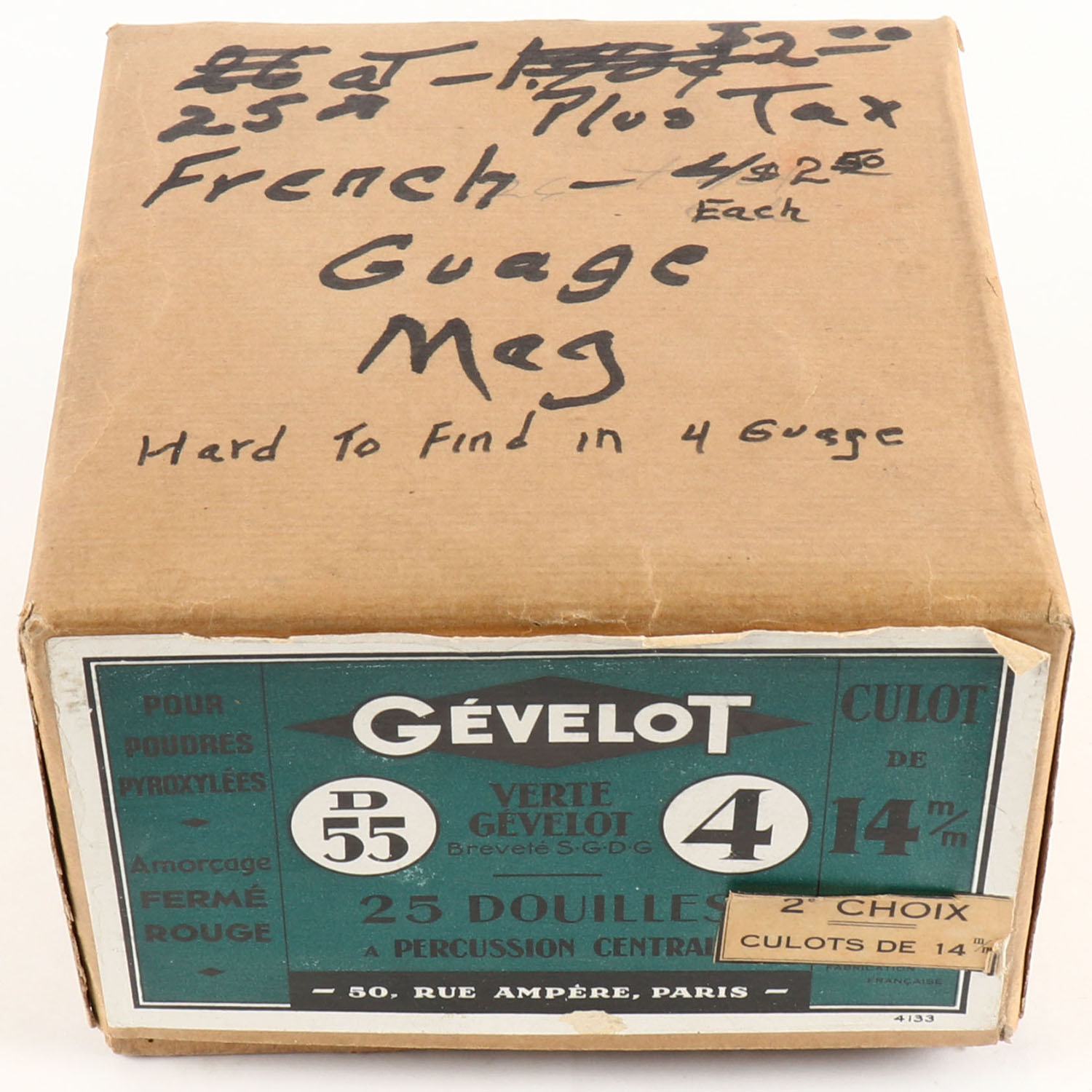 Gevelot, 4ga., 2pc., Full of NPE, 4'', buff box with blue, black & white label, box has writing to top, Shells are excellent. Grade: Excellent - Value: 200 to 600