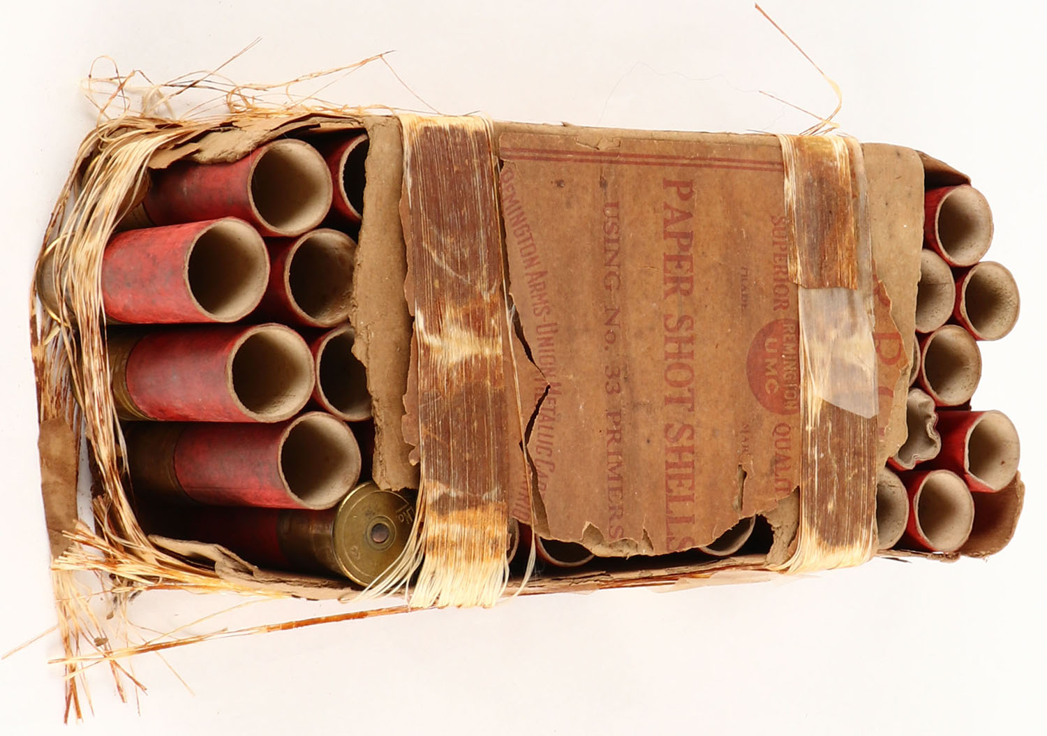 RARE SHOE BOX, Remington UMC, ARROW, 8ga., 2pc., Full of NPE, buff box with buff & red label, box has torn end flaps, soiling, seam splits and scuffing, Shells are very good. Grade: Good - Value: 500 to 2000