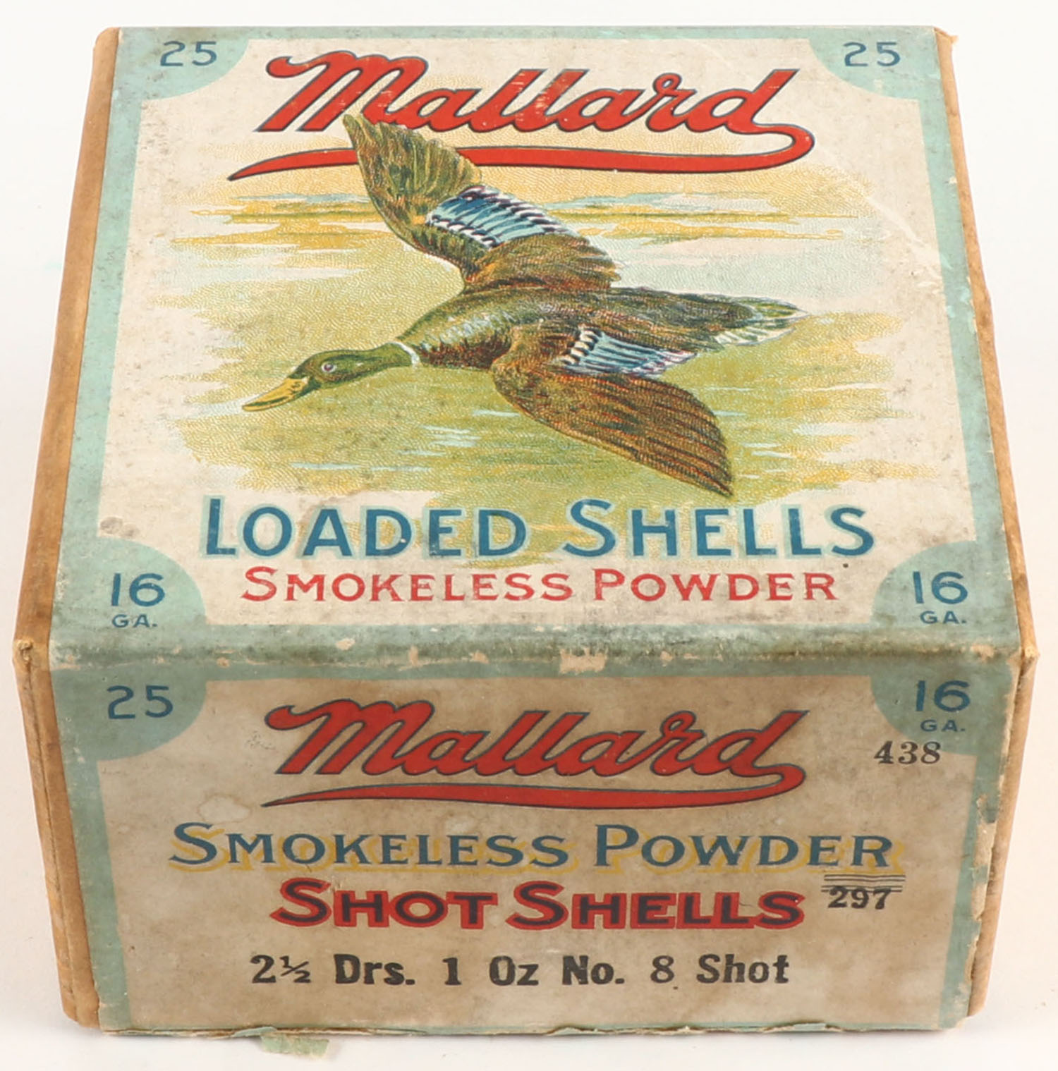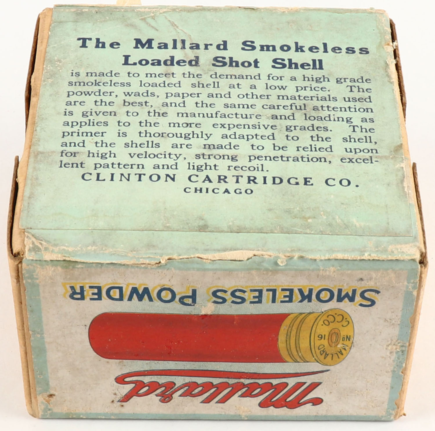 RARE! Clinton Cartridge Co., MALLARD, 16ga., 2pc., Empty, shot size 8, Loading 2 1/2 Drs. 1oz. No. 8 Shot, buff box with multi colored label picturing a Mallard flying down, box has very nice colors with light soiling & scuffing, label is 100% ORIGINAL, VERY RARE BOX! Grade: Very Good ++ - Value: 400 to 1000