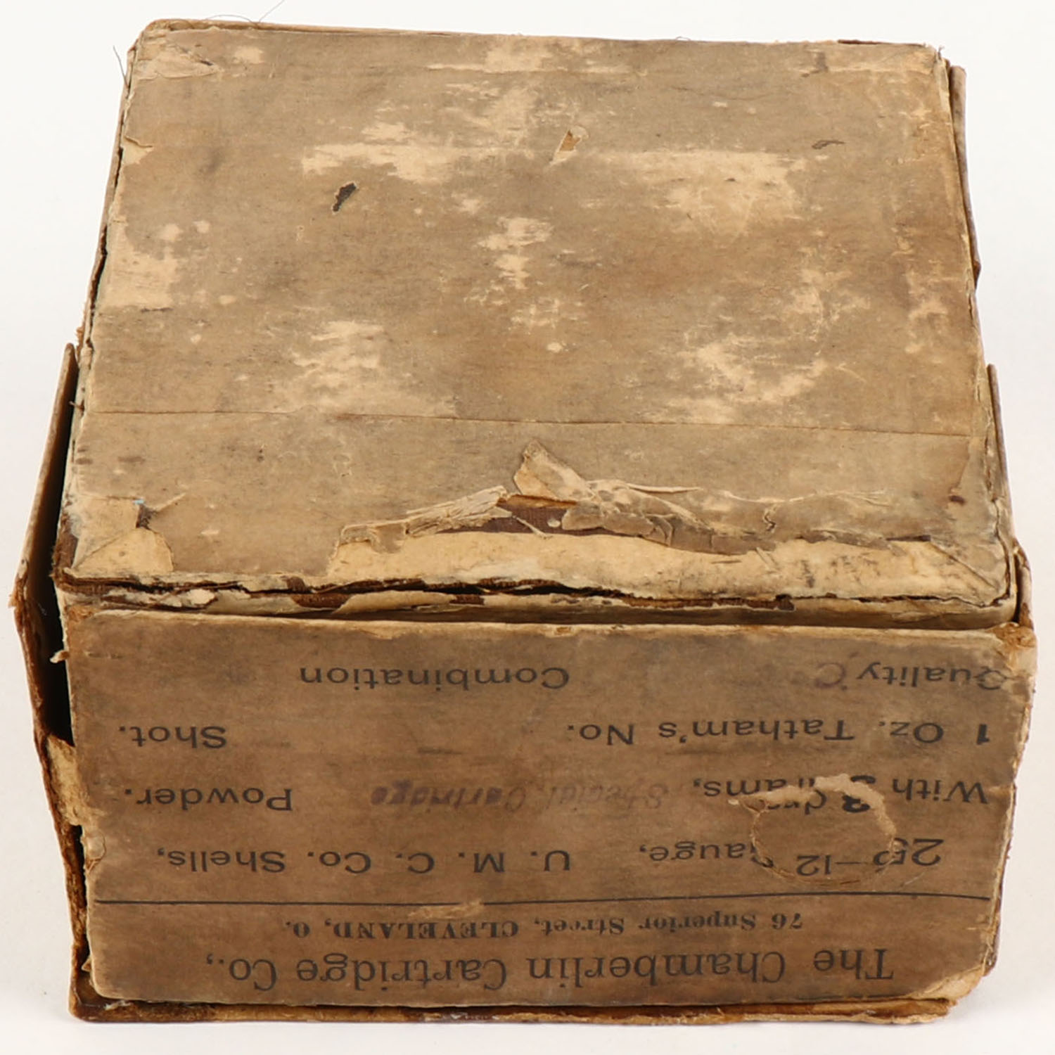 Chamberlin Cartridges, 12ga., 2pc., Full, shot size 6, shells headstamped U.M.C.Co. No 12, buff box with buff & black label, box has age soiling & scuffing, box has seam splits, Shells are very good. Grade: Very Good - Value: 300 to 500