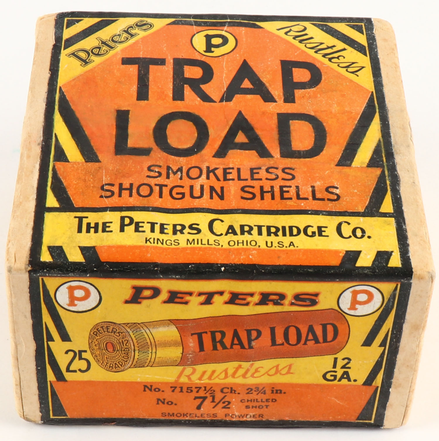 Peters Cart. Co., TRAP LOAD, 12ga., 2 3/4'', 2pc., FULL & SEALED, ''HALLOWEEN BOX'' buff box with orange, yellow, white & black paper label, shot size 7 1/2 Ch., box has been professionally restored, box is very solid with excellent colors. Grade: Excellent + - Value: 500 to 2500