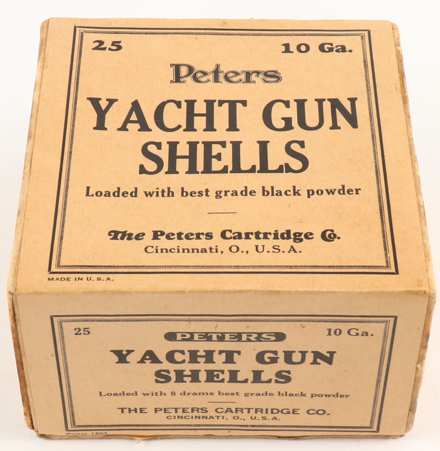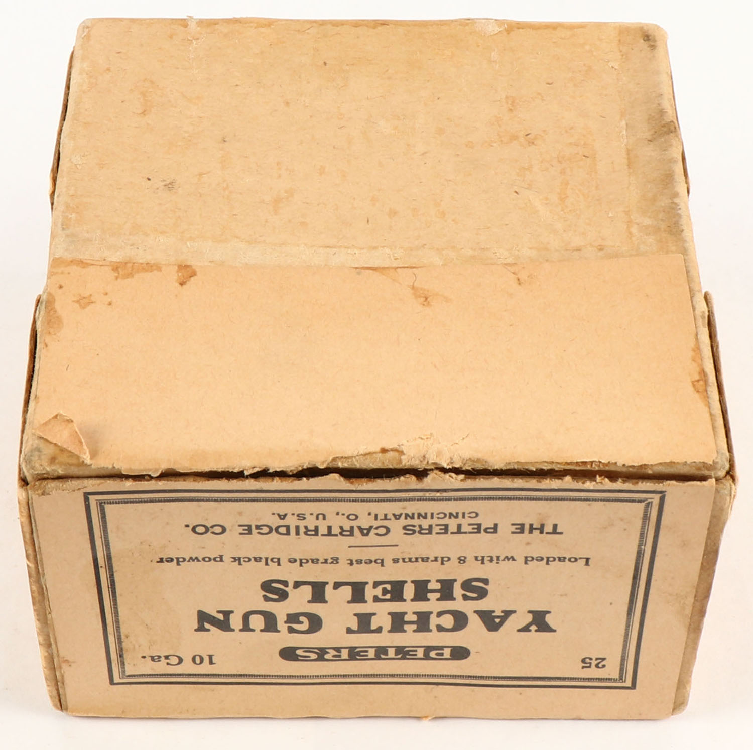 Peters Cart. Co., Yacht Gun Shells, 10ga., 2pc., Empty, buff box with black print, box has minor edgewear otherwise very solid. Grade: Excellent - Value: 100 to 400