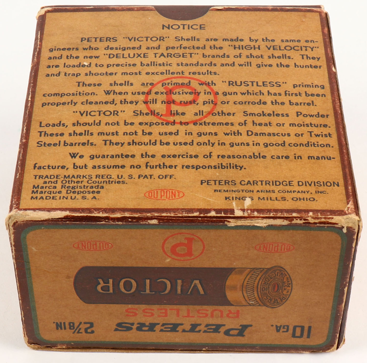 Peters Cart. Div., Victor, Rustless, 10ga., 1pc., Full, shot size 6CH, Maroon, cream & orange box, 2 7/8'', box has light edge wear & light soiling with very nice colors, paper shells are excellent. Grade: Very Good ++ - Value: 50 to 150