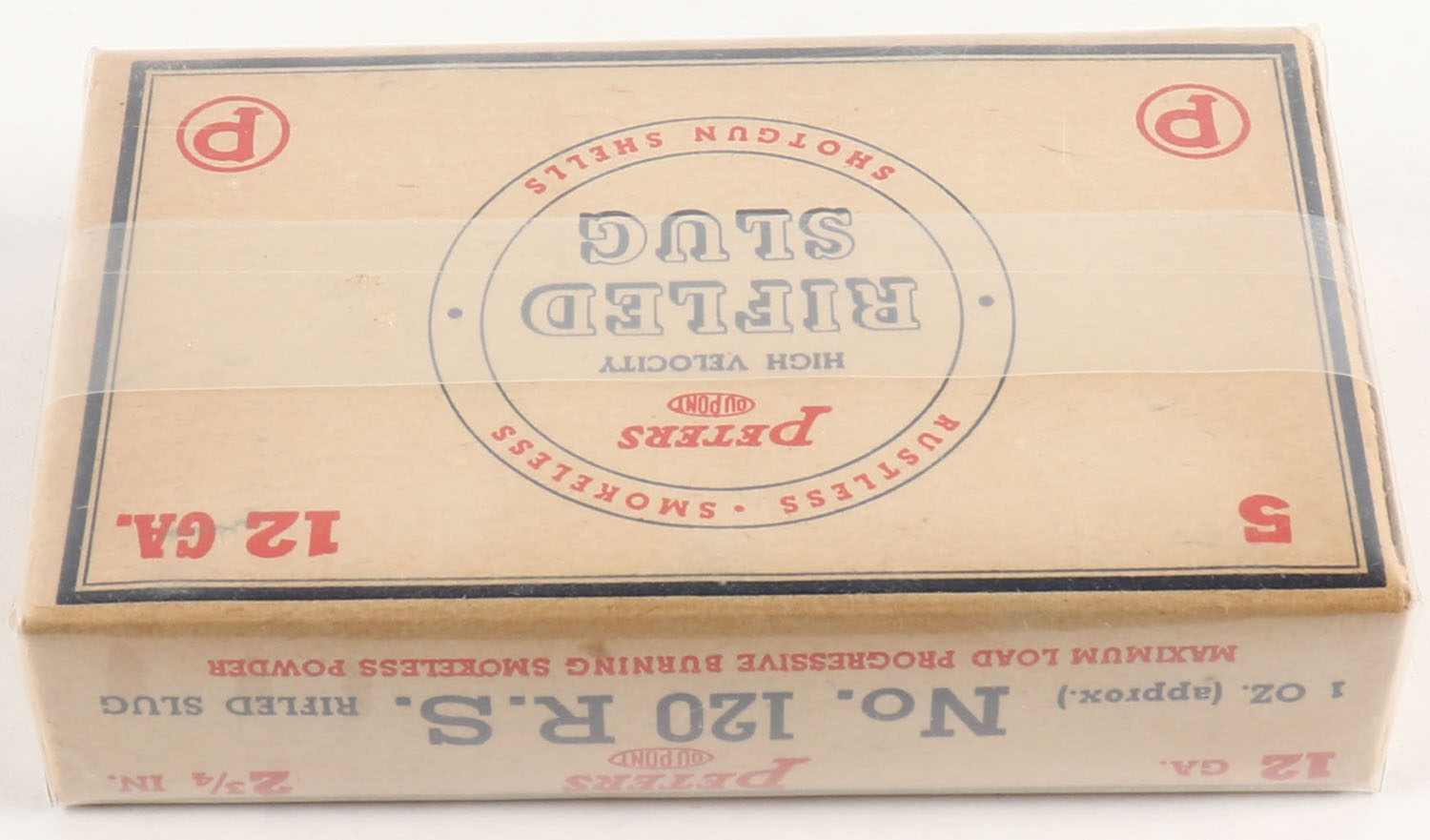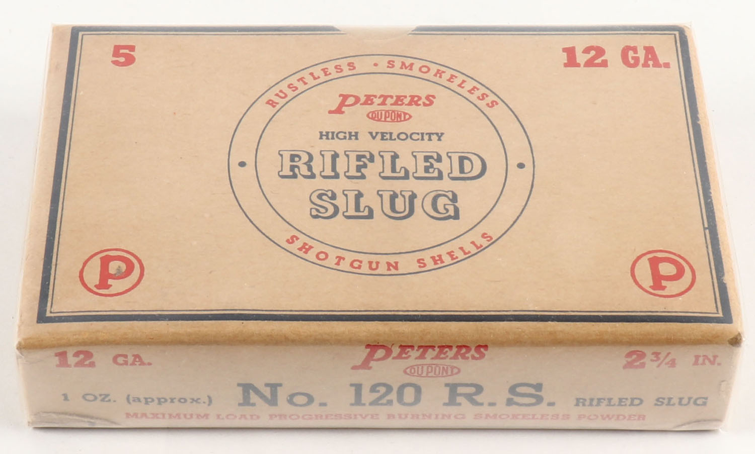 Peters Cart. Div., 12ga., 2 3/4'', 1pc., Full, shot size Rifled Slug, blue, orange & buff colored box, box is very solid with very nice colors, paper shells are excellent. Grade: Excellent - Value: 10 to 40