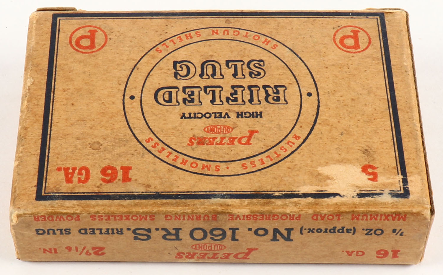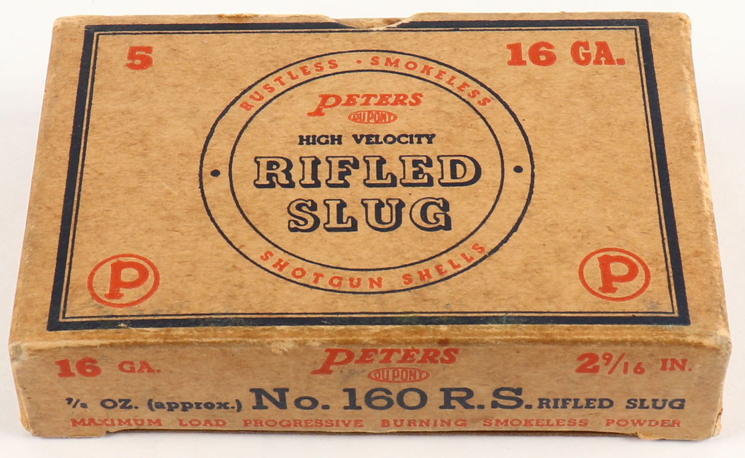 Peters Cart. Div., 16ga., 2 9/16'', 1pc., Full, shot size Rifled Slug, blue, orange & buff colored box, box is very solid with very nice colors, paper shells are excellent. Grade: Excellent - Value: 10 to 40