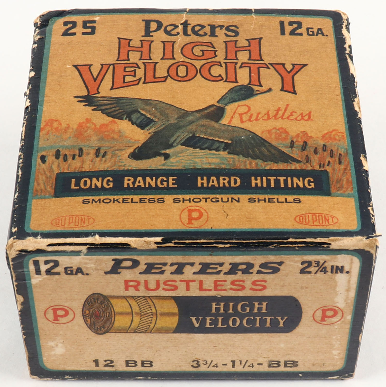Peters Cart. Co., Bridgeport, CT, High Velocity, 12ga., 2 3/4'', 1pc., Partial 14rds., shot size BB, multi colored box that pictures mallard flying out of the marsh grass, box has age soiling with edge wear, shells are excellent. Grade: Good ++ - Value: 30 to 80
