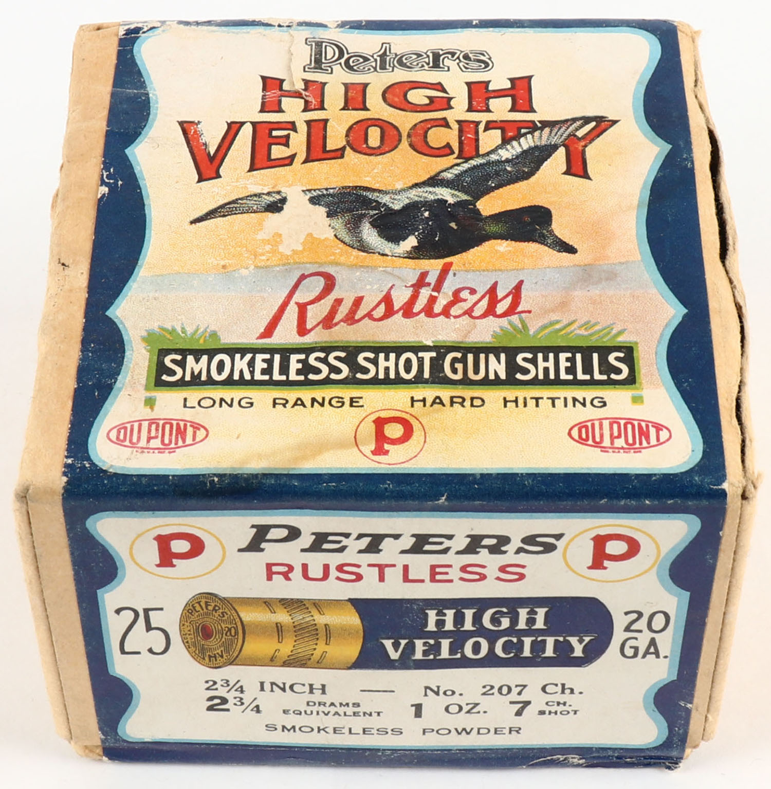 Peters Cart. Co., Blue Bill, 20ga., 2pc., FULL & SEALED, shot size 7CH, buff box with multi colored label that pictures Blue Bill in flight, box has a seam split with edge wear, has light scuffing with great colors. Grade: Very Good ++ - Value: 100 to 300
