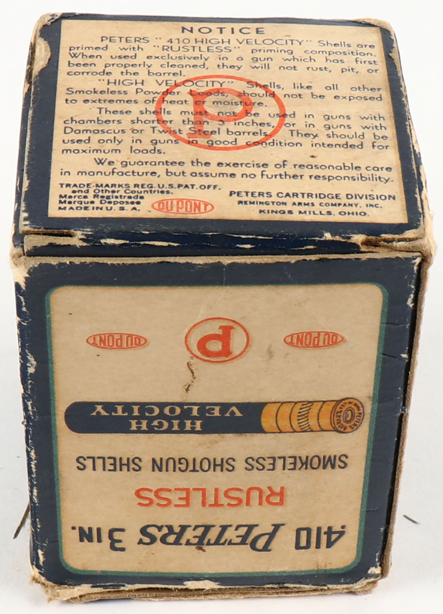 Peters, High Velocity, 410ga., 3'', 1pc., Full, shot size 6CH, multi-colored box with mallard duck flying out of marsh grass, box has a torn top flap, has edge wear with some scuffing, Shells are excellent. Grade: Very Good ++ - Value: 20 to 80