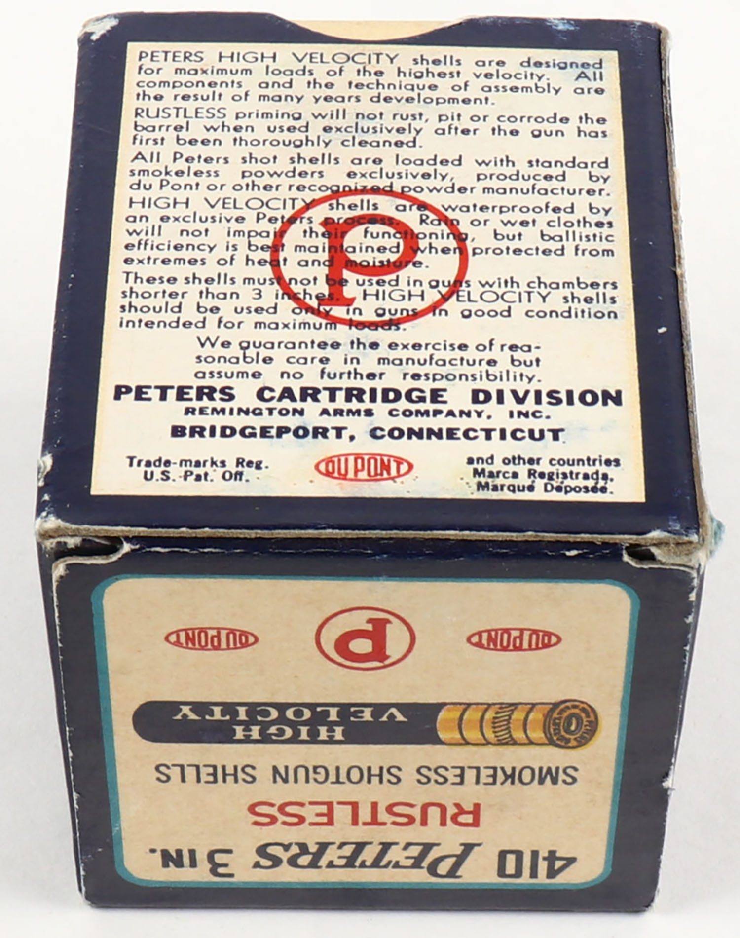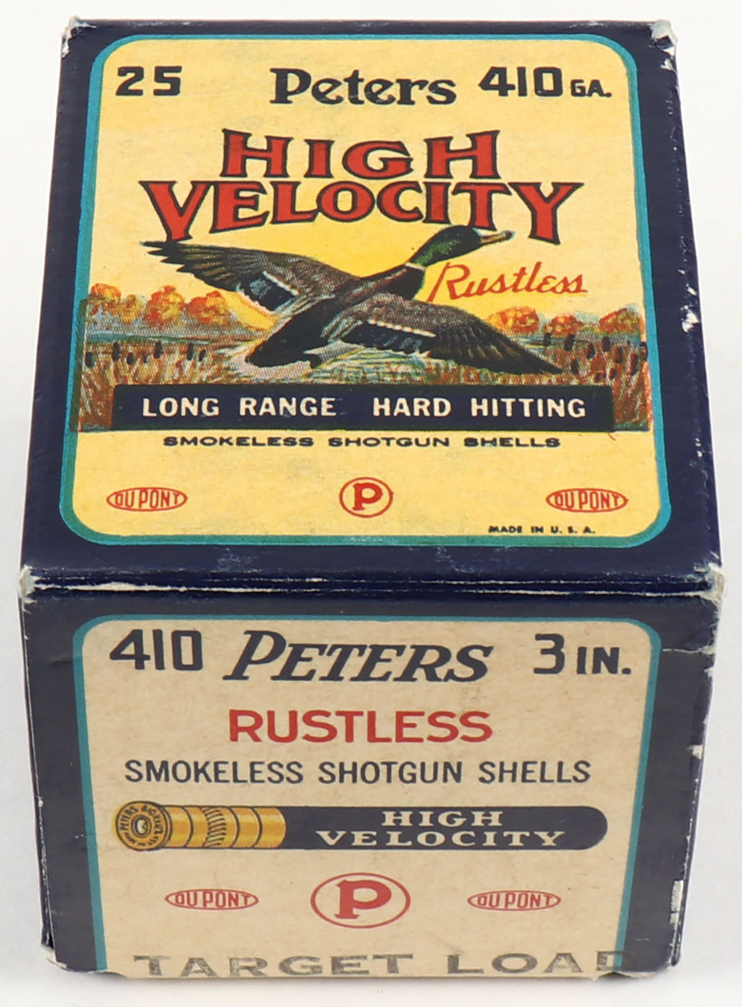 Peters, High Velocity, 410ga., 3 in., 1pc., Full, shot size Target Load, has original insert in box, multi-colored box with mallard duck flying out of marsh grass, box has minor corner wear with excellent colors, shells are excellent. Grade: Excellent + - Value: 40 to 100