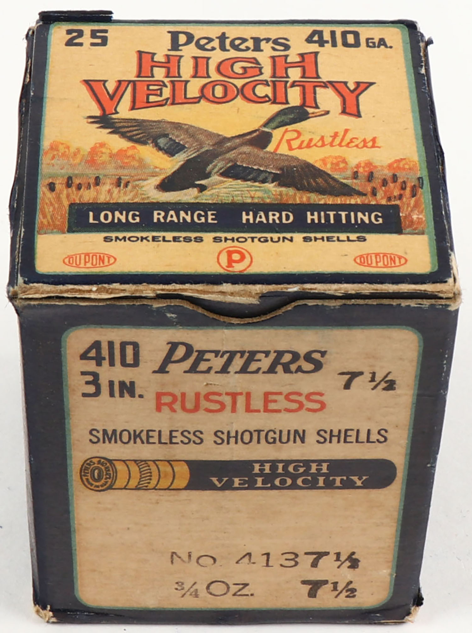 Peters, High Velocity, 410ga., 3 in., 1pc., Full, shot size 7 1/2, multi-colored box with mallard duck flying out of marsh grass, box has light edge wear with excellent colors, shells are excellent. Grade: Very Good ++ - Value: 40 to 100