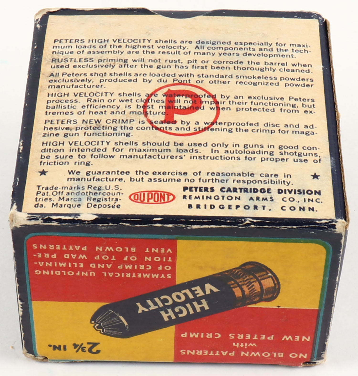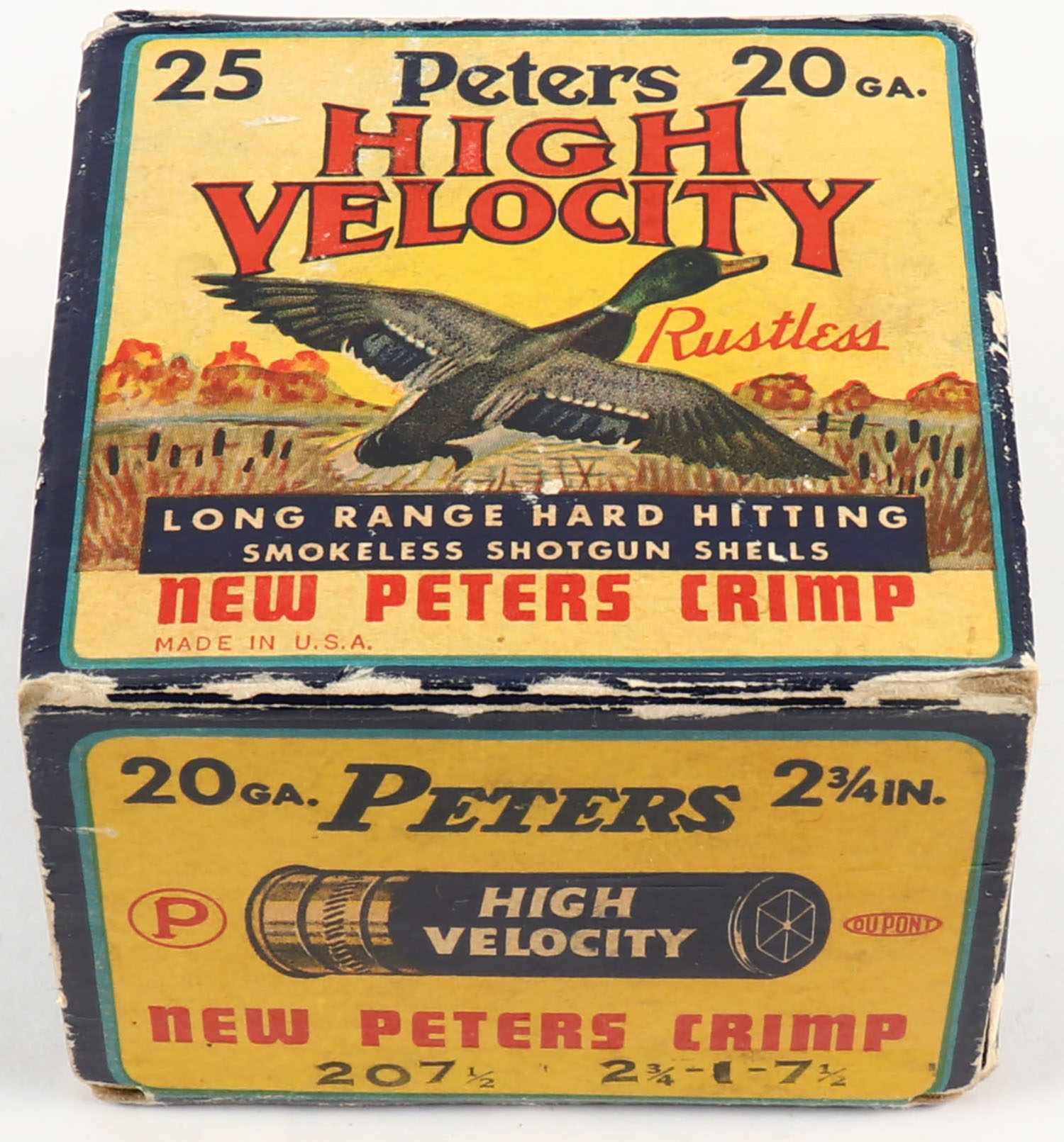 Peters Cart. Co., High Velocity, New Peters Crimp, 20ga., 1pc., Partial 17rds being correct, shot size 7 1/2, multi colored box that pictures mallard flying out of the marsh grass, box has edge wear with excellent color, paper shells are very good. Grade: Very Good + - Value: 20 to 60