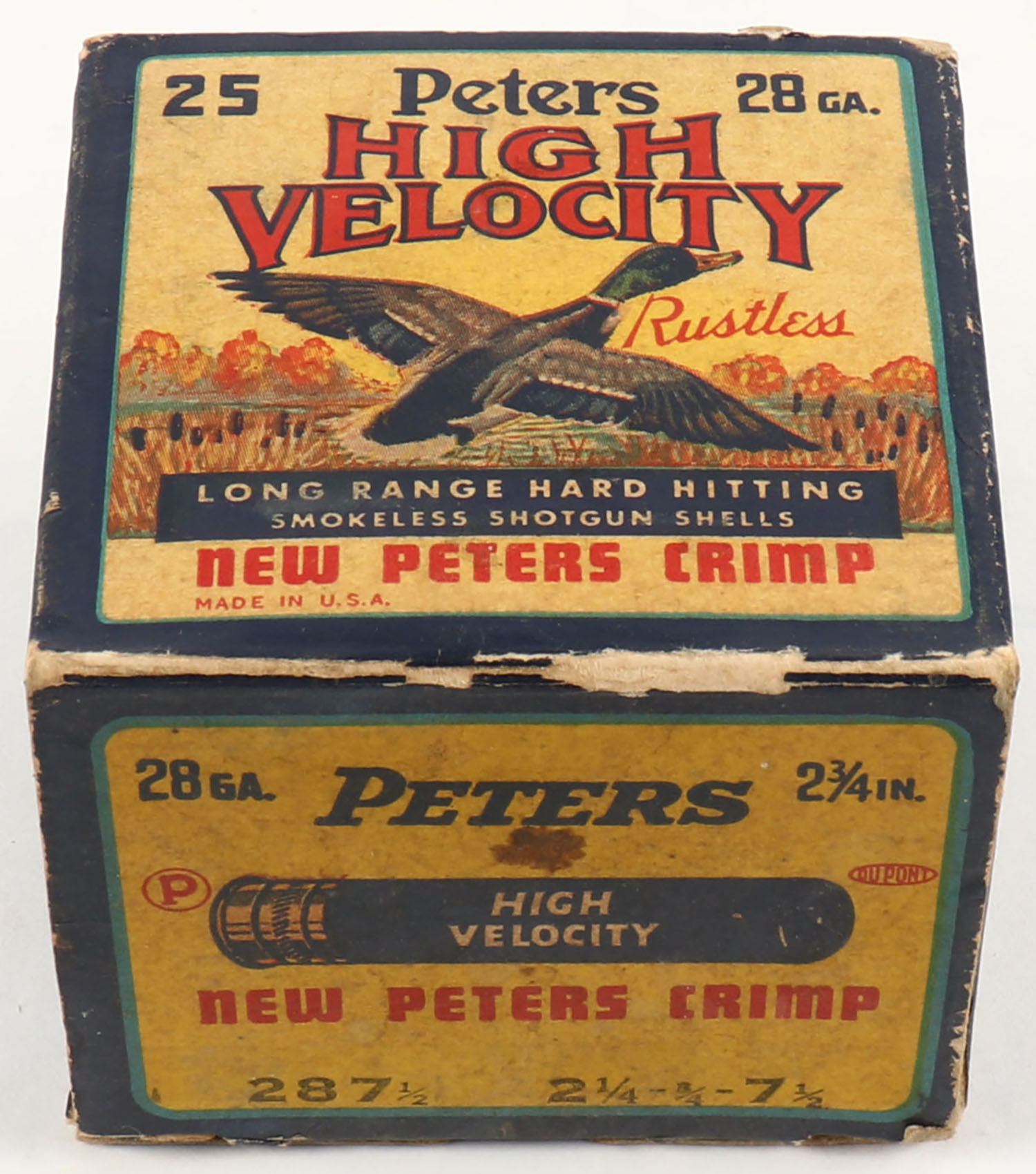 Peters Cart. Co., High Velocity, New Peters Crimp, 28ga., 1pc., Partial 15rds., shot size 7 1/2, multi colored box that pictures mallard flying out of the marsh grass, box has minor scuffing with light edge wear, paper shells are excellent. Grade: Very Good - Value: 20 to 80