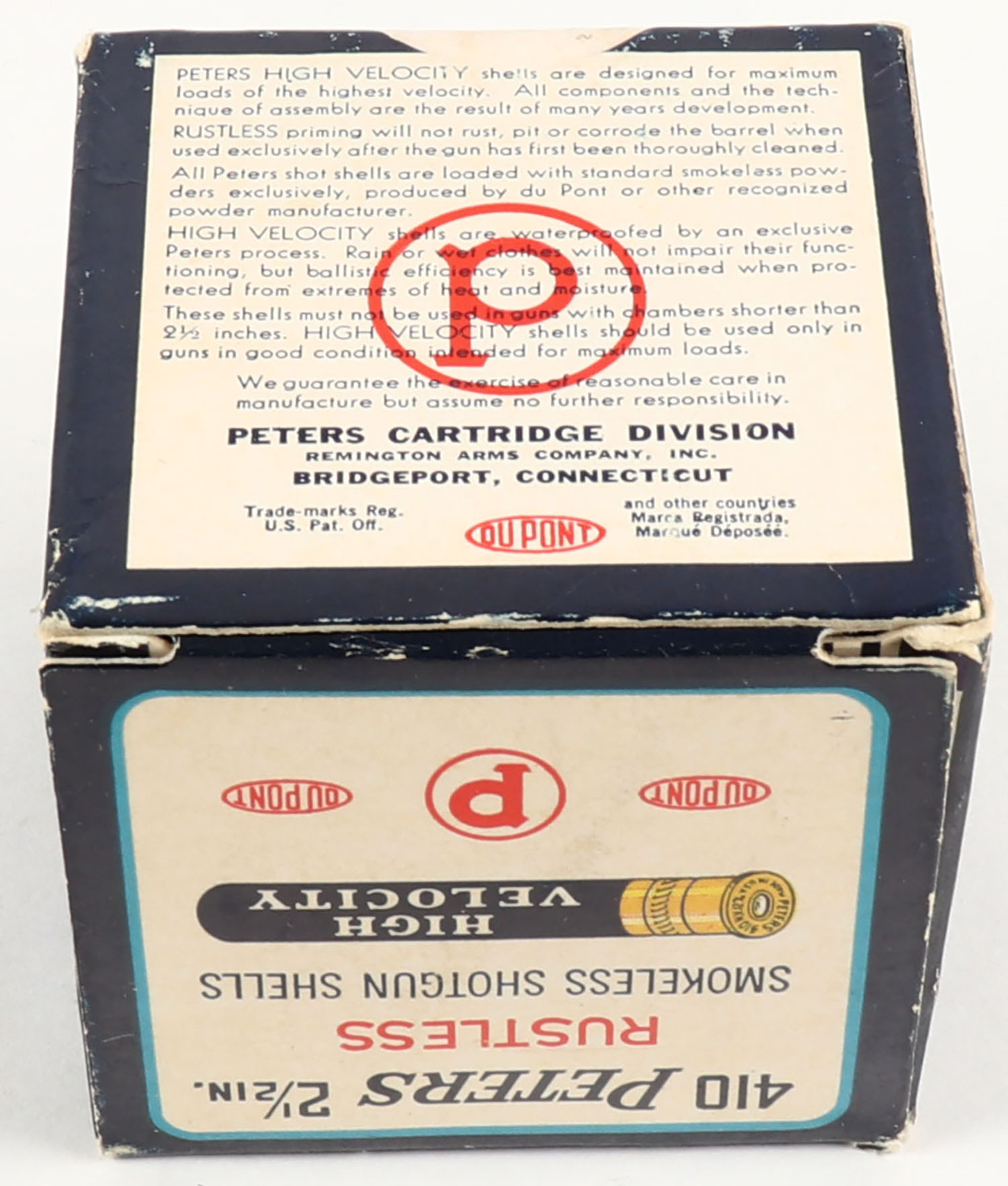 Peters, High Velocity, 410ga., 2 1/2'', 1pc., Full, shot size 6, multi-colored box with mallard duck flying out of marsh grass, box is very solid with excellent colors, paper shells are excellent. Grade: Excellent ++ - Value: 40 to 100