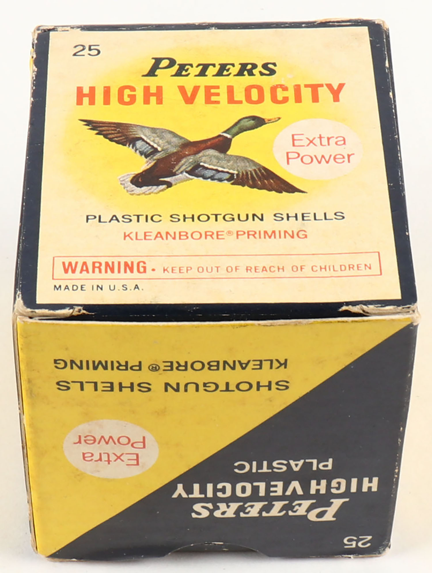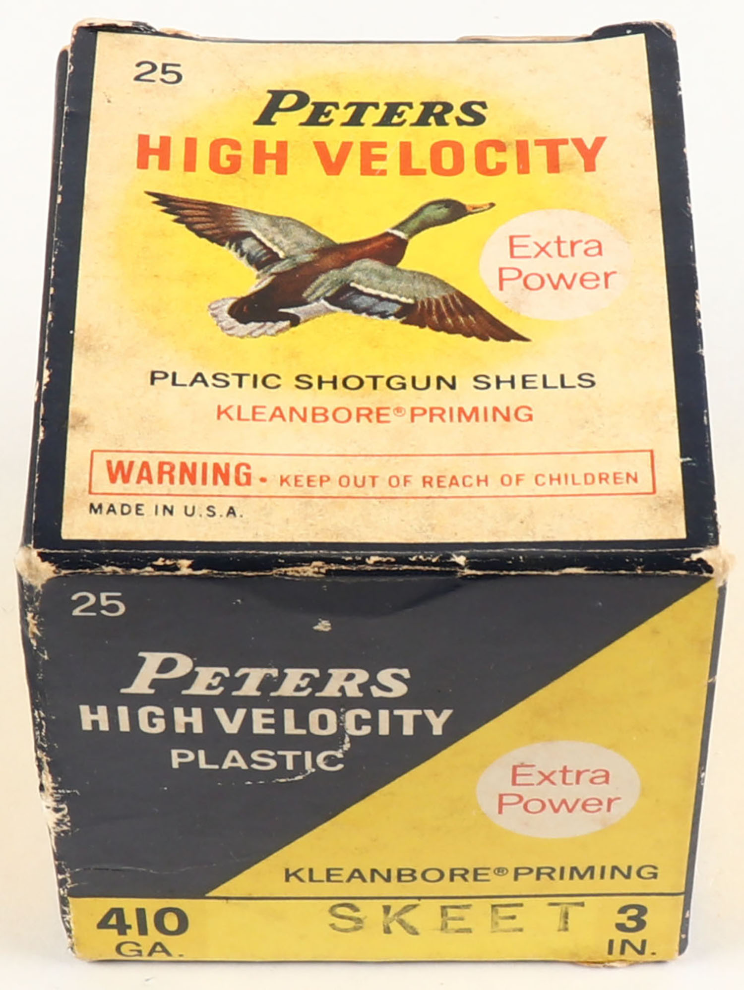Peters Cart. Co., High Velocity, 410ga, 3'', 1pc., Partial 20rds., shot size 9 Skeet, multi colored box that pictures mallard flying, box is solid with some scuffing, plastic shells are very good. Grade: Very Good - Value: 10 to 30