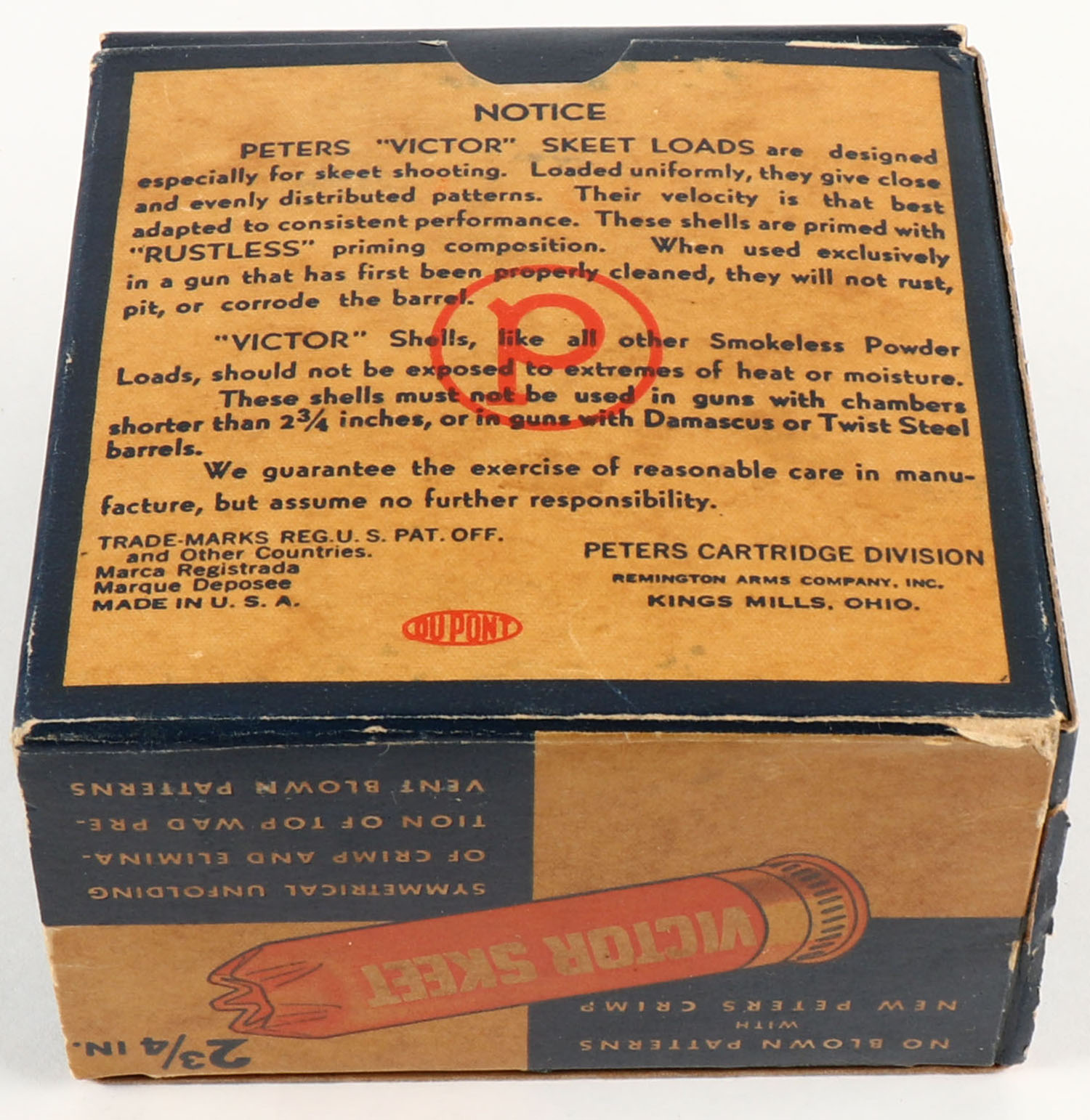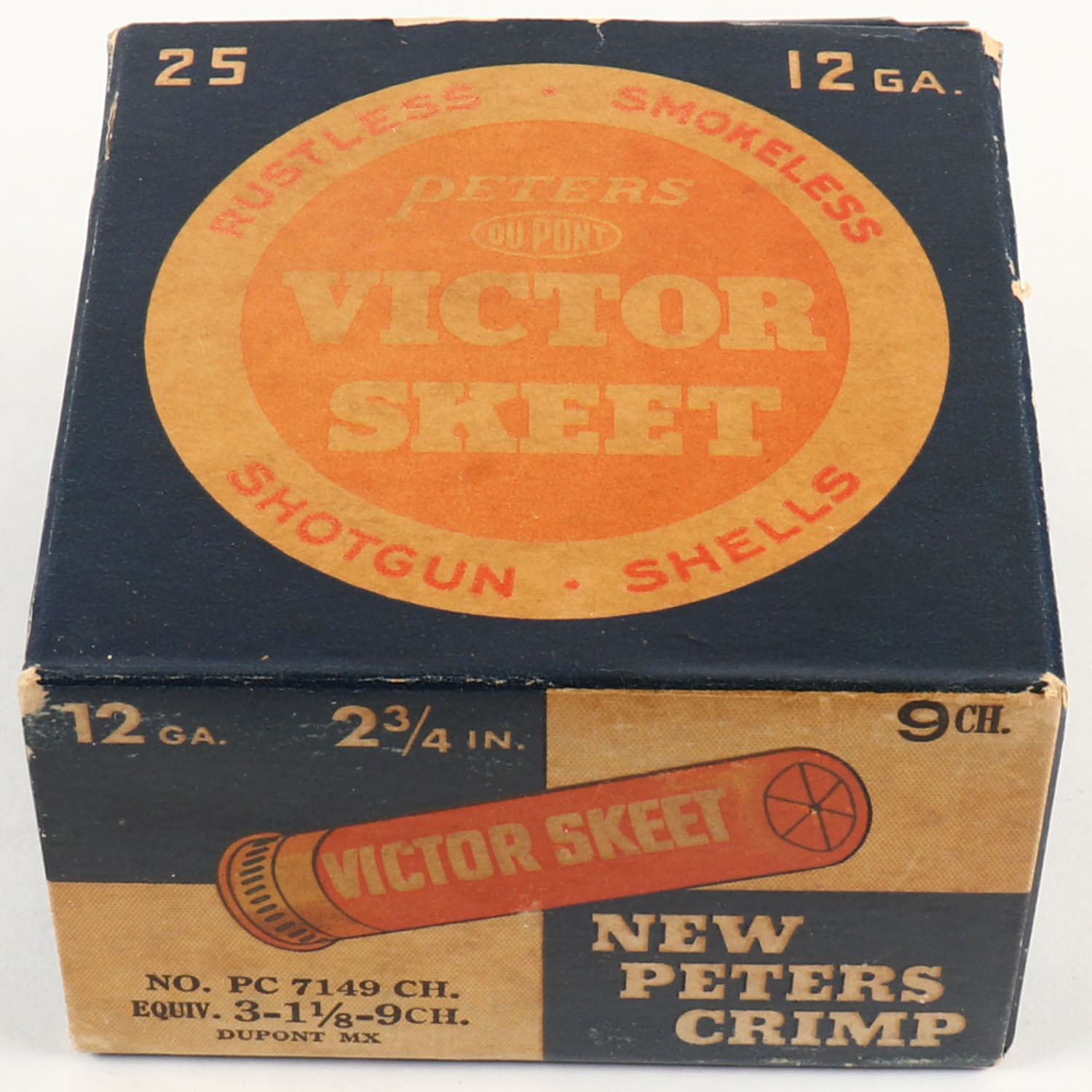 Peters Cart. Div., Victor Skeet, 12ga., 2 3/4'', 1pc., Full, shot size 9 CH, blue, orange & buff colored box, box has light edge wear with very nice colors, paper shells are excellent. Grade: Excellent - Value: 20 to 60