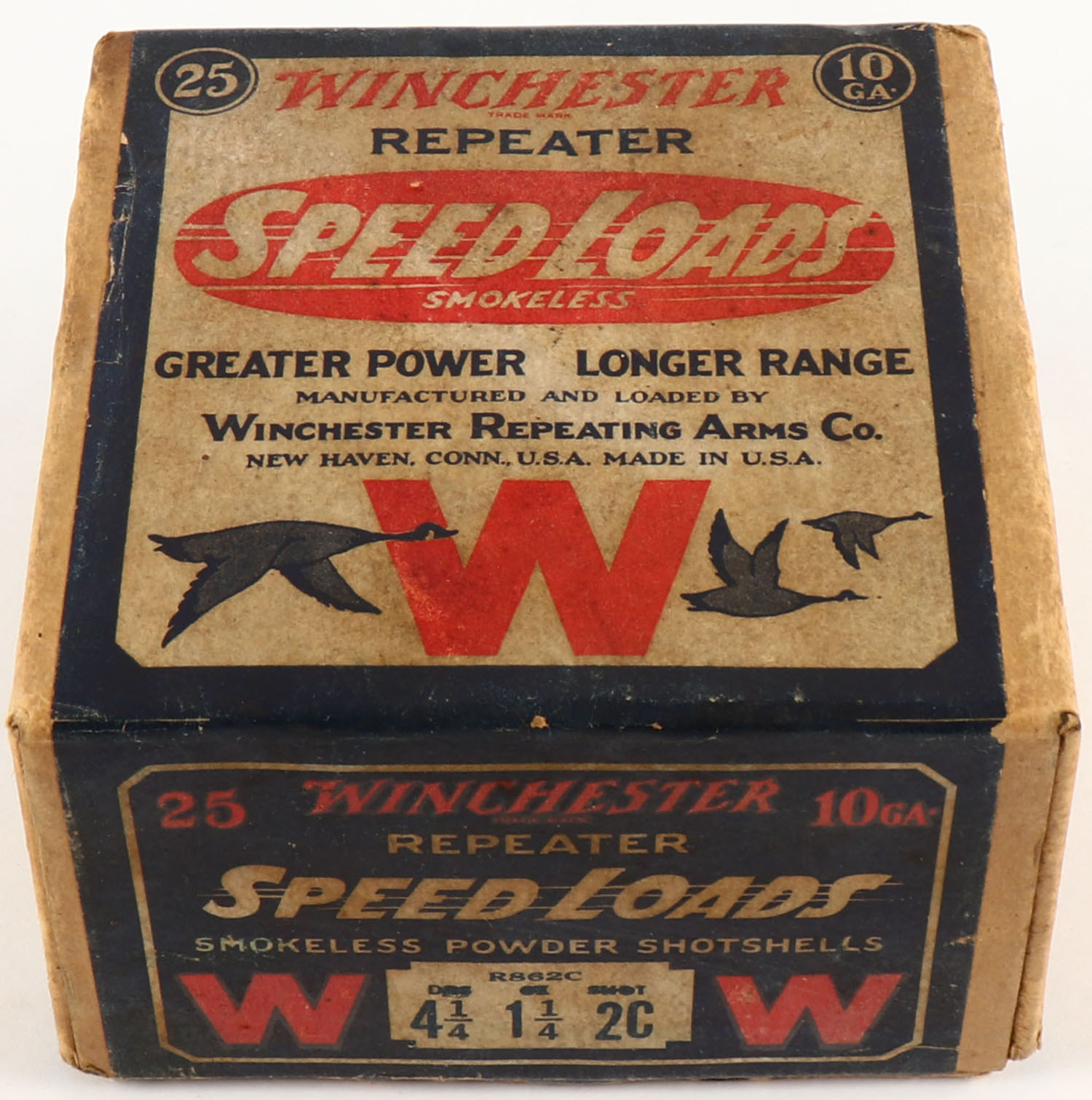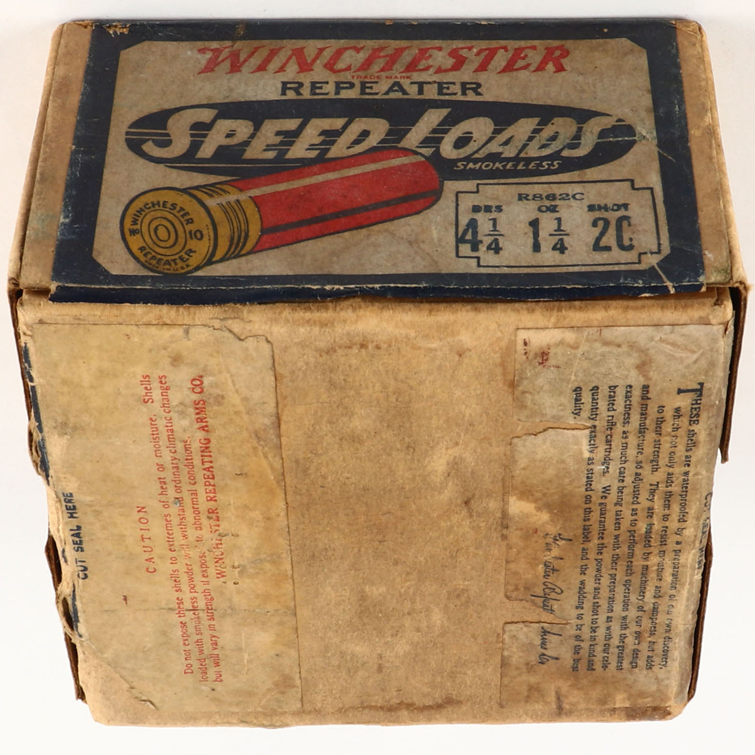 Winchester REPEATER Speed Loads, 10ga., 2pc., Partial 24rds. Of mixed repeater shells, shot size 2C, buff box with dark blue red & white paper label, box has age soiling with light scuffing, paper shells are very good. Grade: Very Good ++ - Value: 100 to 300